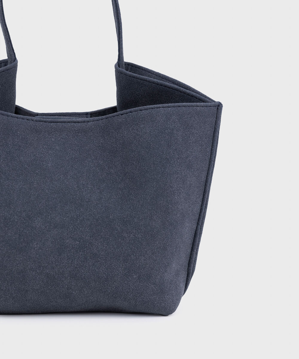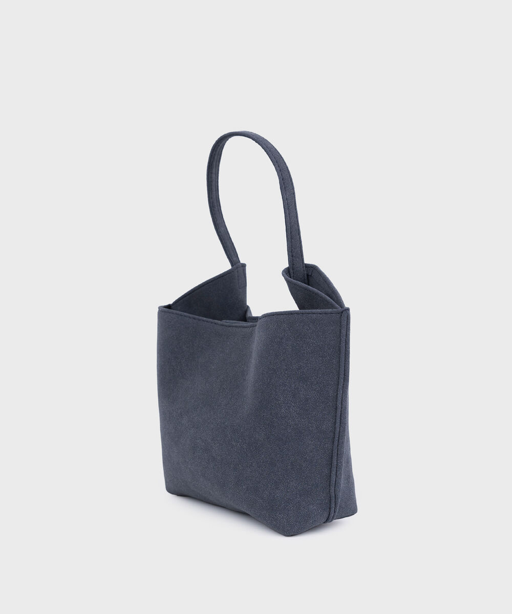 Refresh your style with our blue grey top handle bag with inverted side gazettes and a magnetic snap closure.