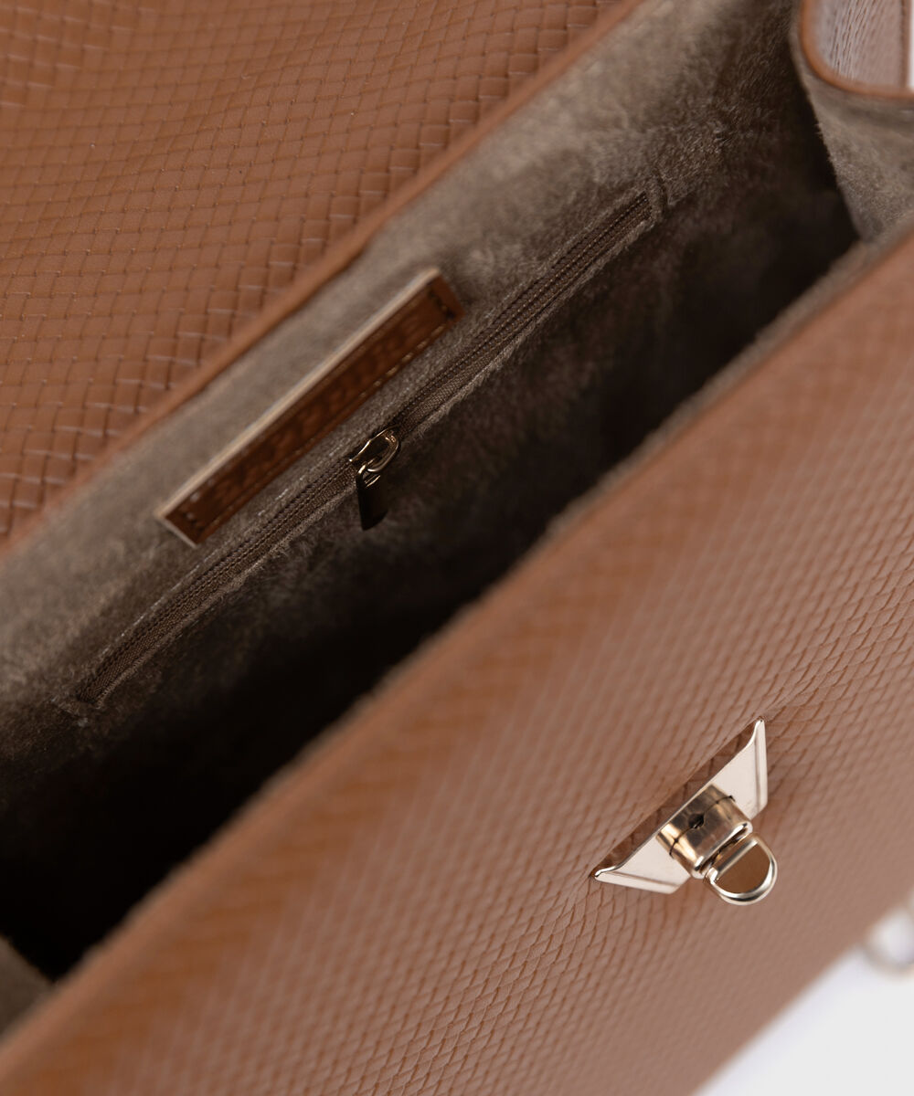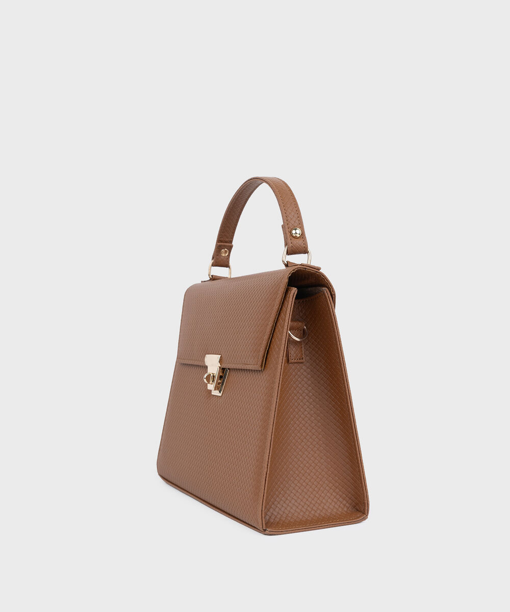 Perfect your style with our textured tan top handle bag with a tuck lock closure.