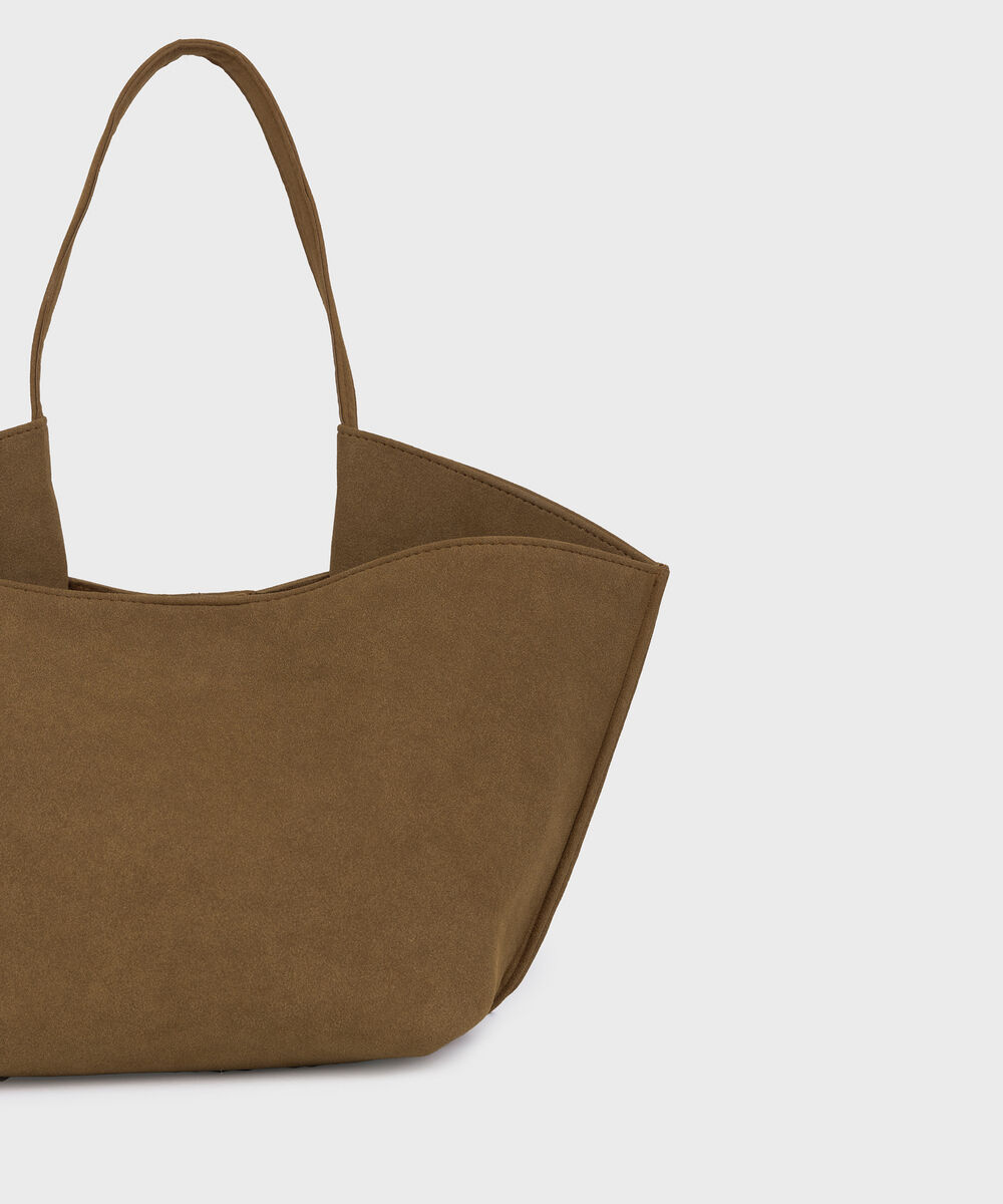 Refresh your style with our tan tote bag with inverted side gazettes and a magnetic snap closure.