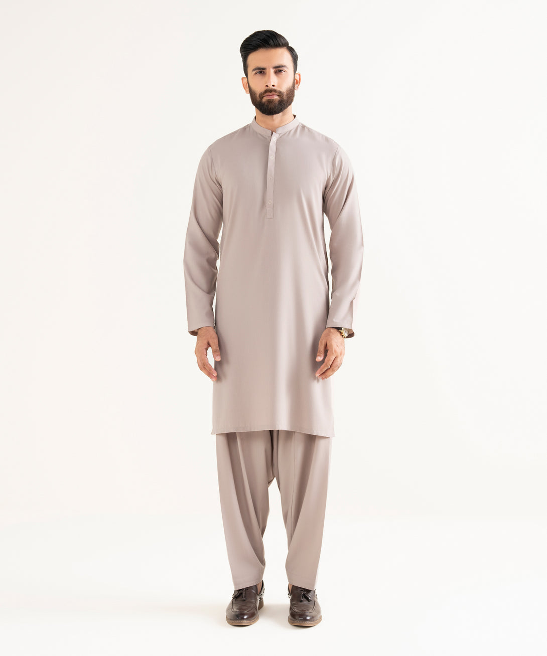 Make a dapper statement with our mauve embroidered straight kurta and shalwar.