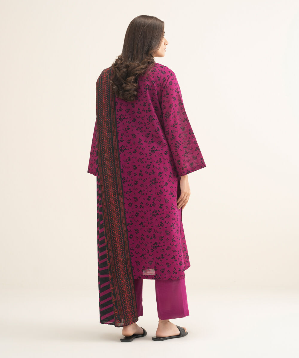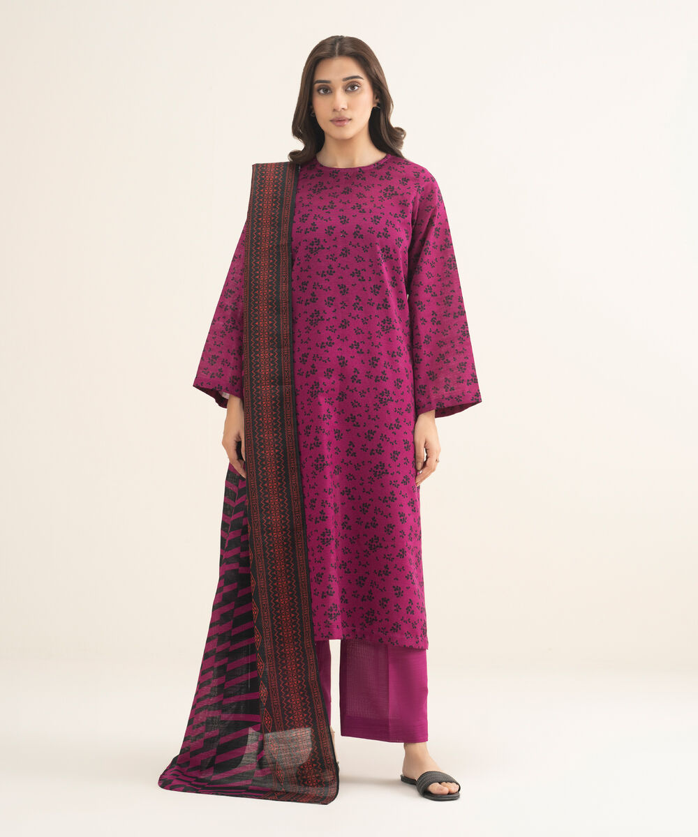 Make a statement with our three-piece printed pink and black ensemble featuring a khaddar shirt and trousers paired with a matching dupatta.