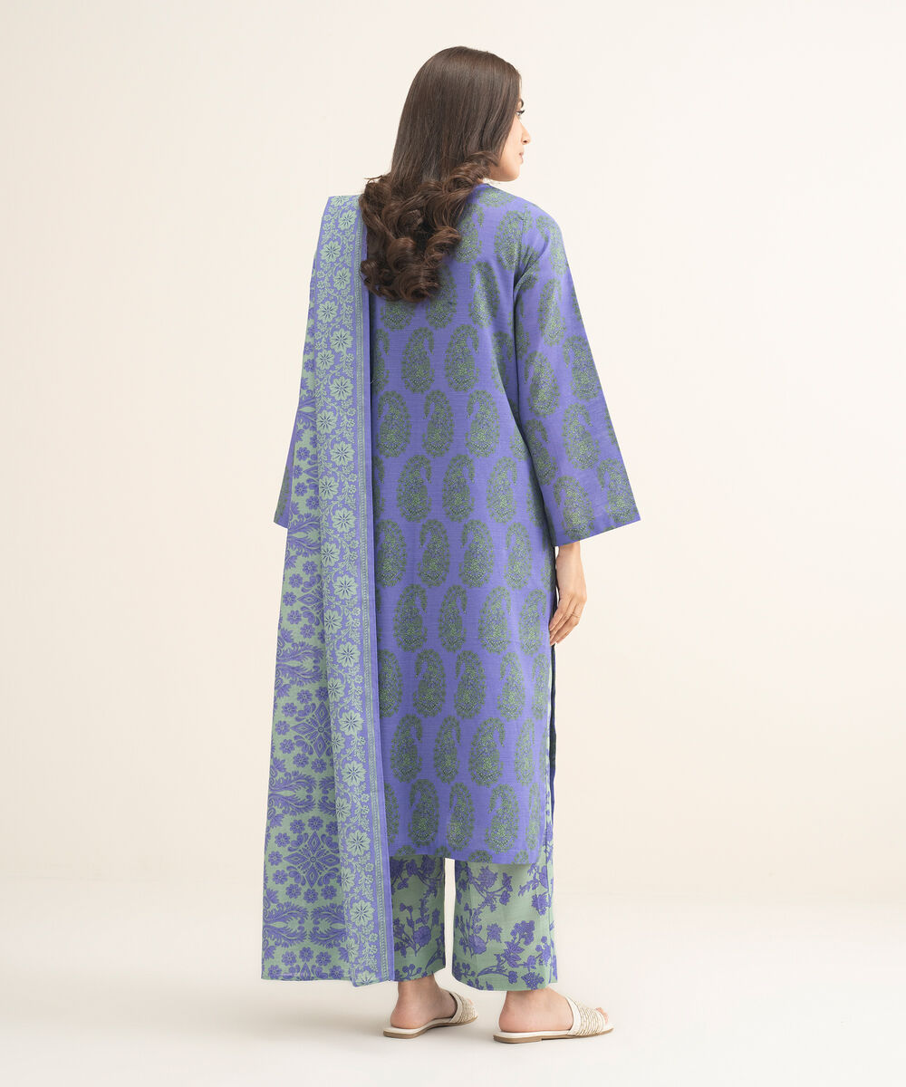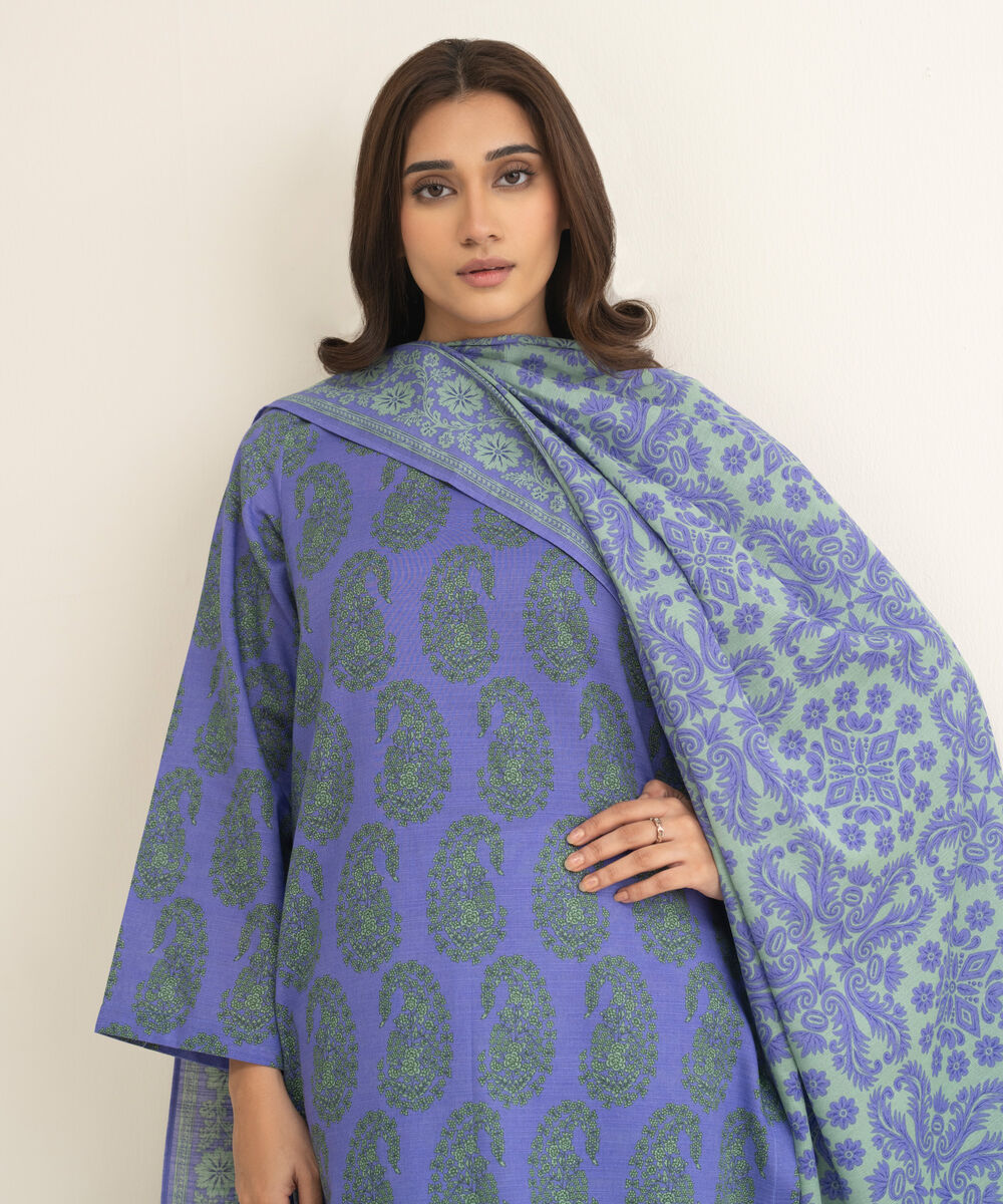 Make a statement with our three-piece printed mint green and mauve ensemble featuring a khaddar shirt and trousers paired with a matching dupatta.