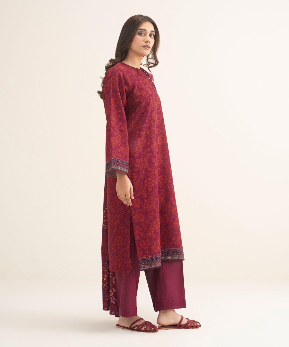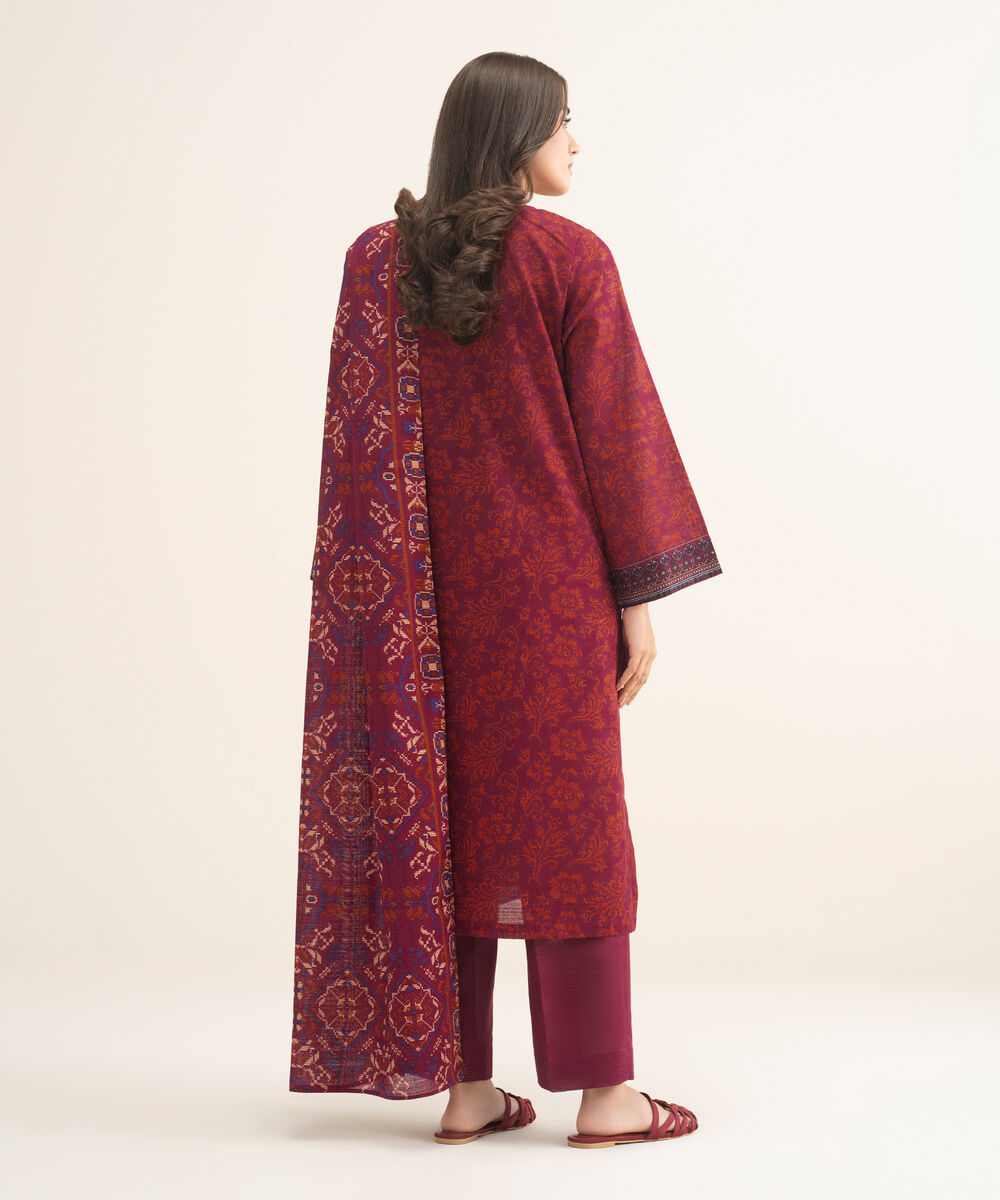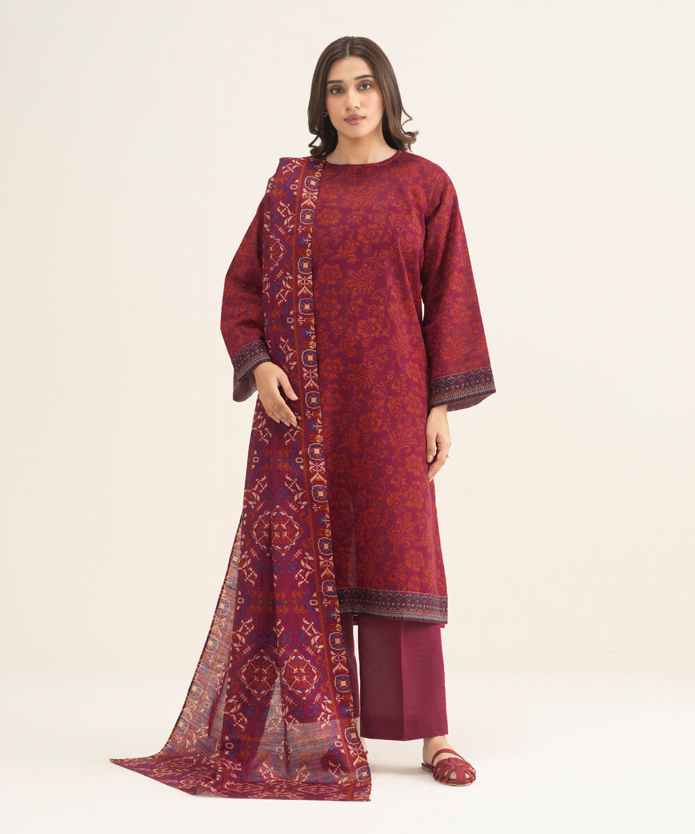 Make a statement with our three-piece printed maroon and burnt orange ensemble featuring a khaddar shirt and trousers paired with a matching dupatta.