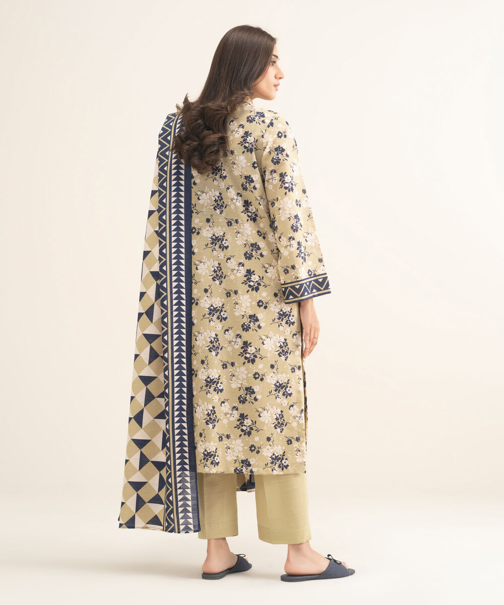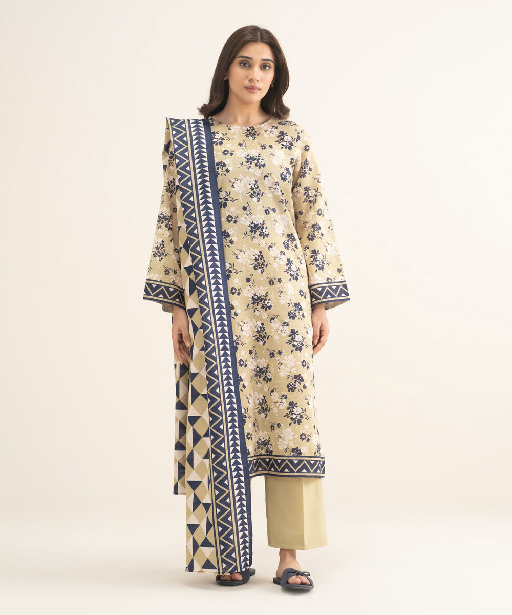 Make a statement with our three-piece printed beige and grey ensemble featuring a khaddar shirt and trousers paired with a matching dupatta.