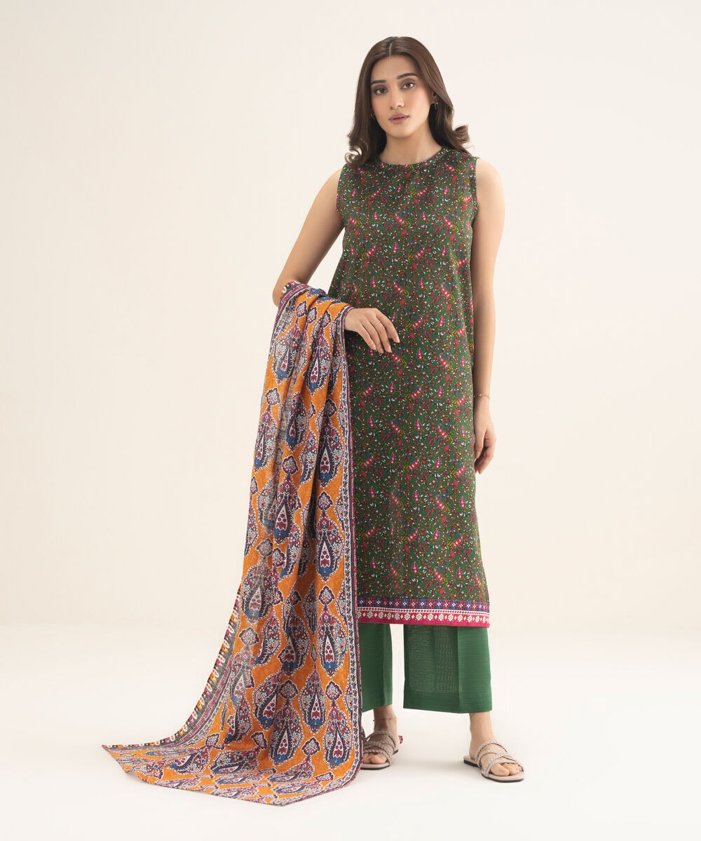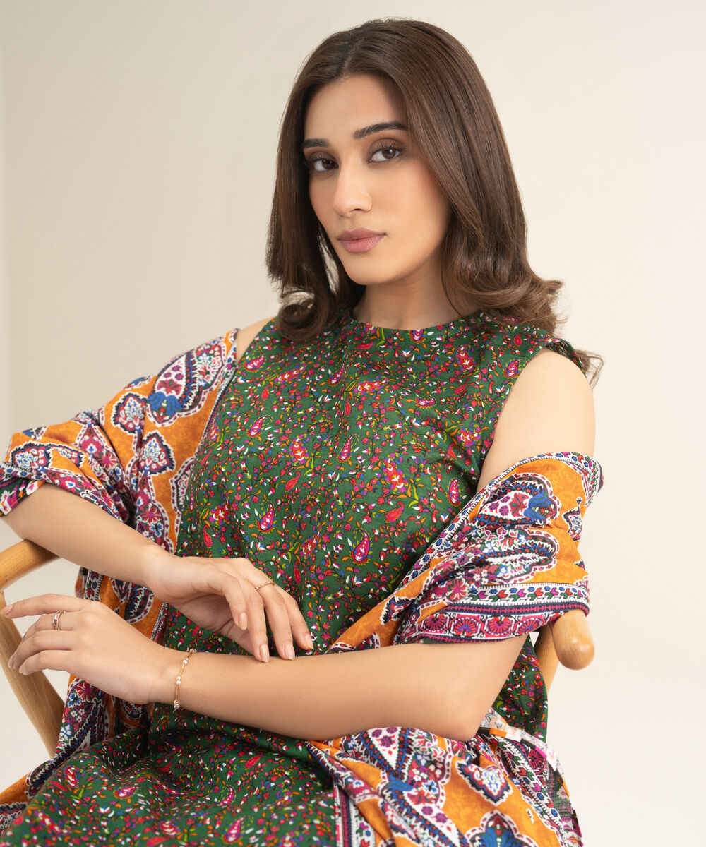 Make a statement with our three-piece printed green ensemble featuring a khaddar shirt and trousers paired with a matching dupatta.