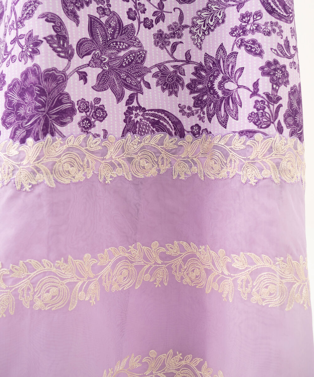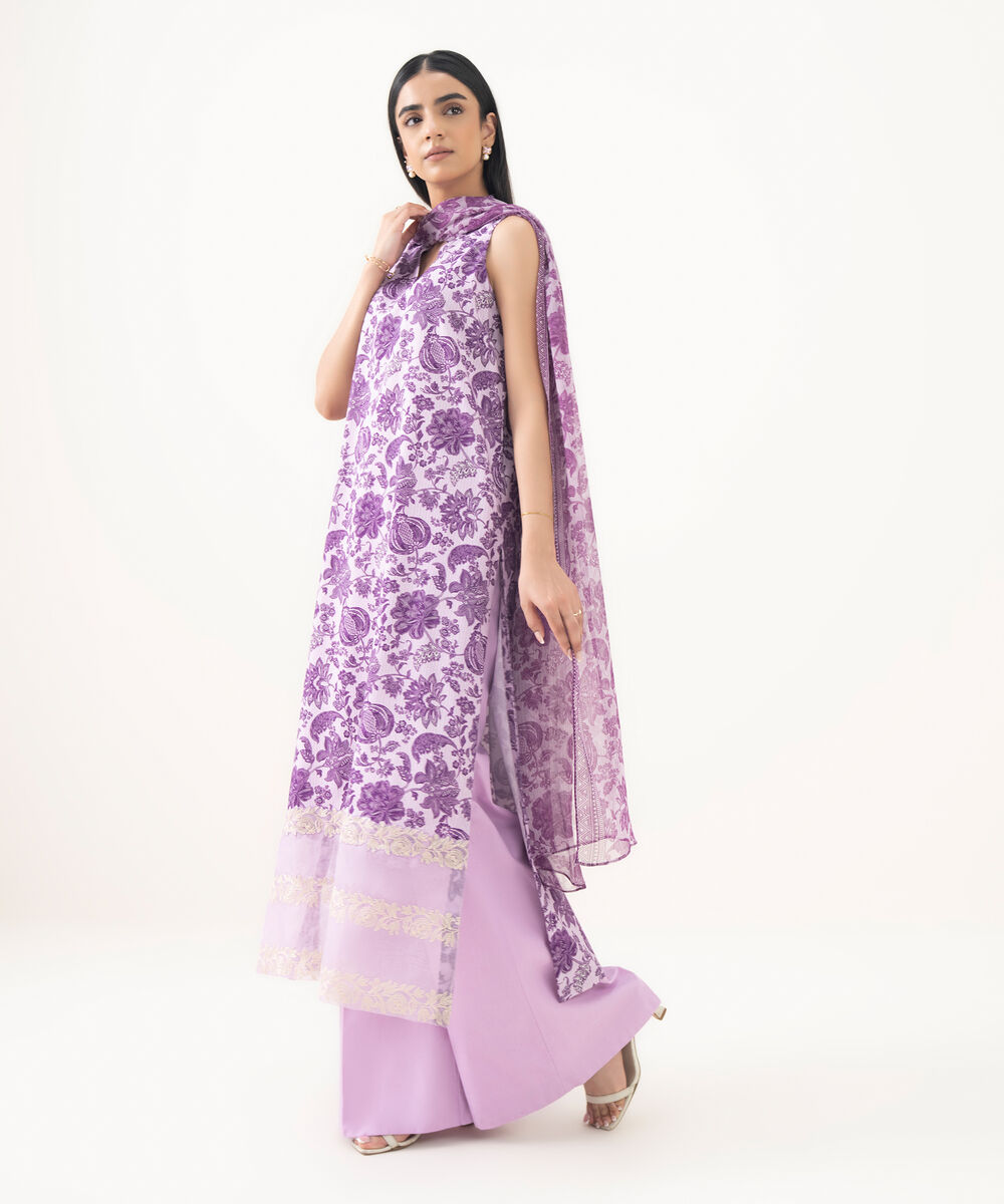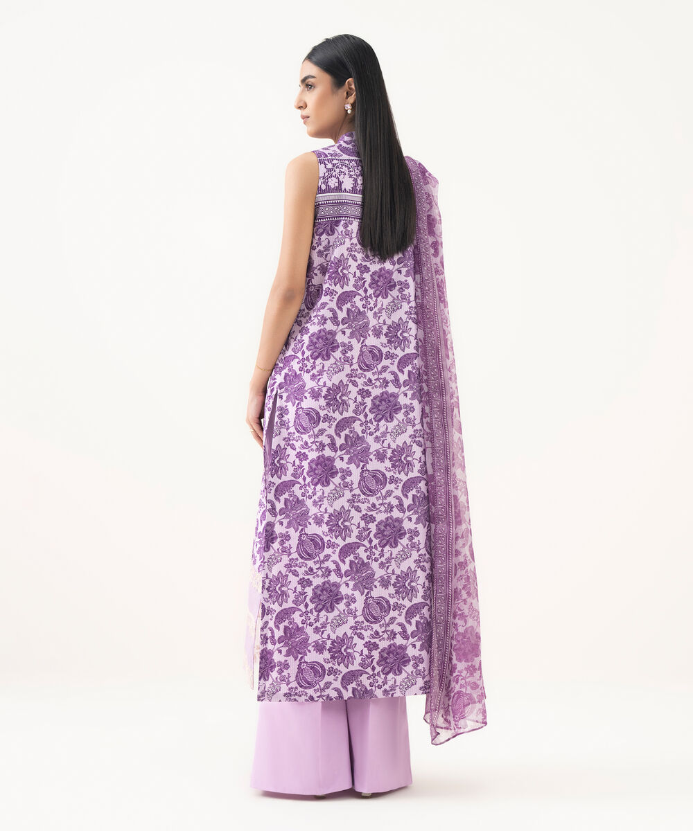 Make a statement with our three-piece embroidered light purple ensemble featuring a lawn shirt paired with a blended chiffon dupatta and cotton trousers.