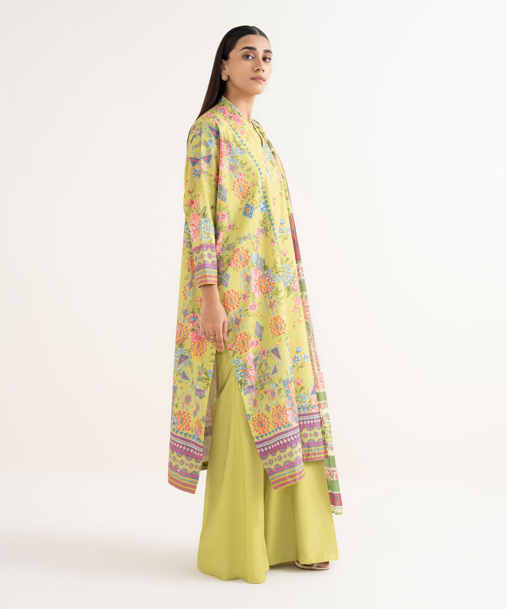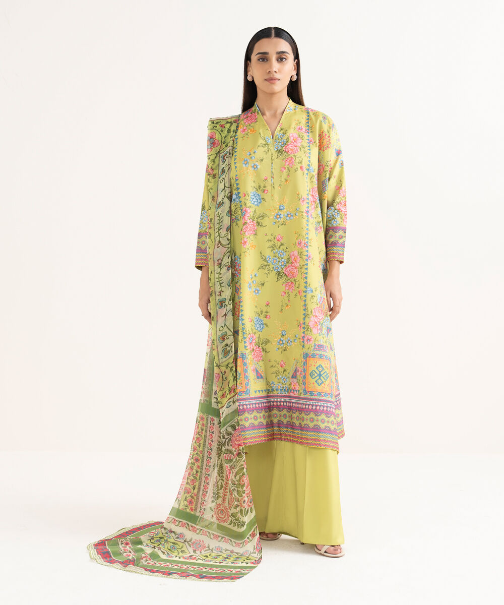 Make a statement with our three-piece printed light green ensemble featuring a lawn shirt paired with a blended chiffon dupatta and cotton trousers.