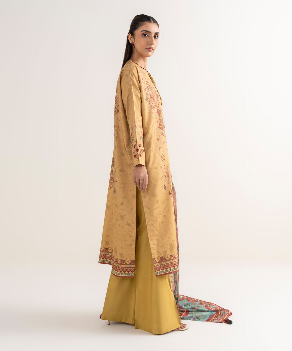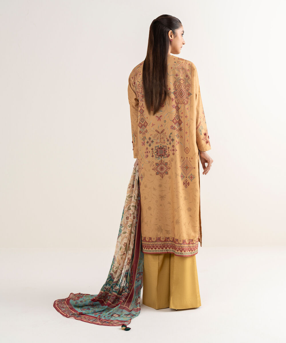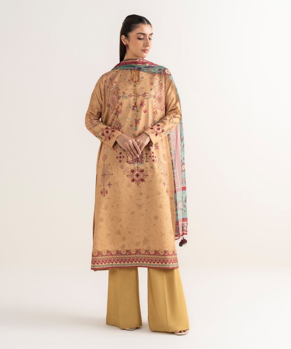Make a statement with our three-piece printed multicoloured ensemble featuring a lawn shirt paired with a blended chiffon dupatta and cotton trousers.