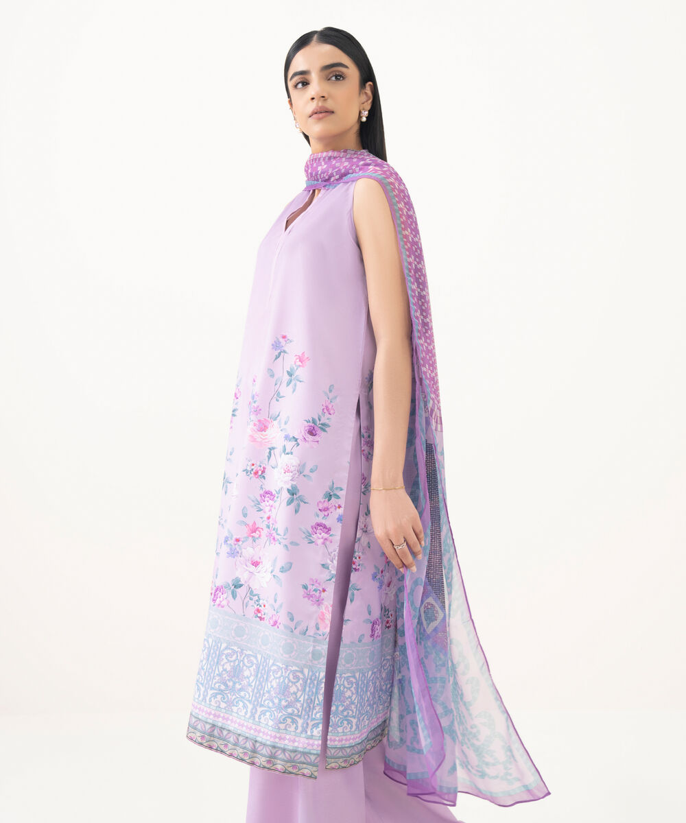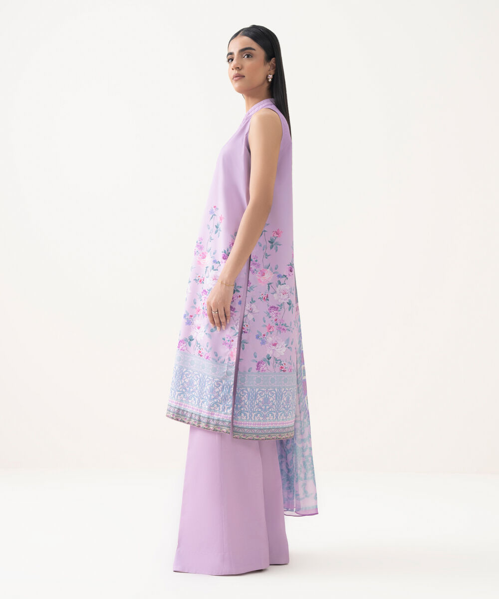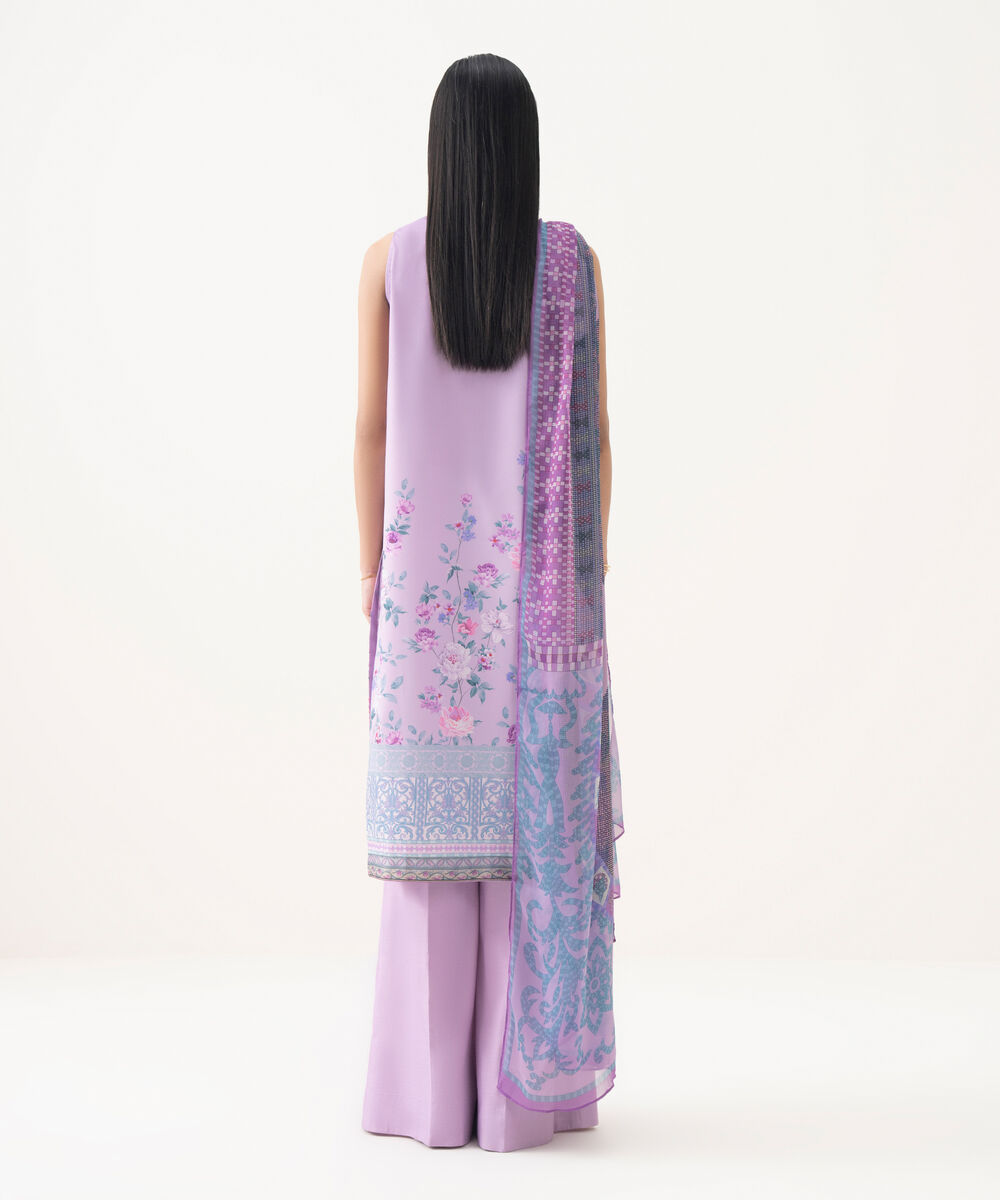 Make a statement with our three-piece printed lilac ensemble featuring a lawn shirt paired with a blended chiffon dupatta and cotton trousers.