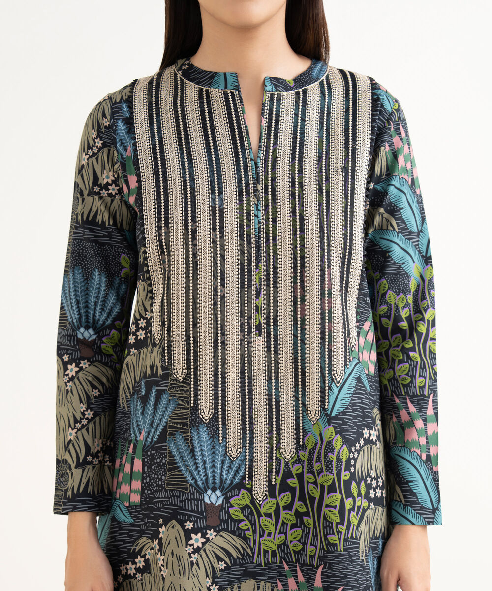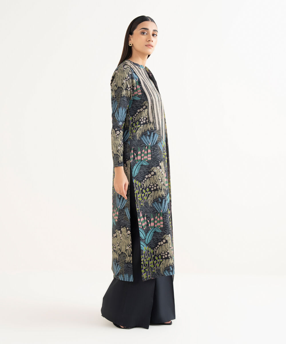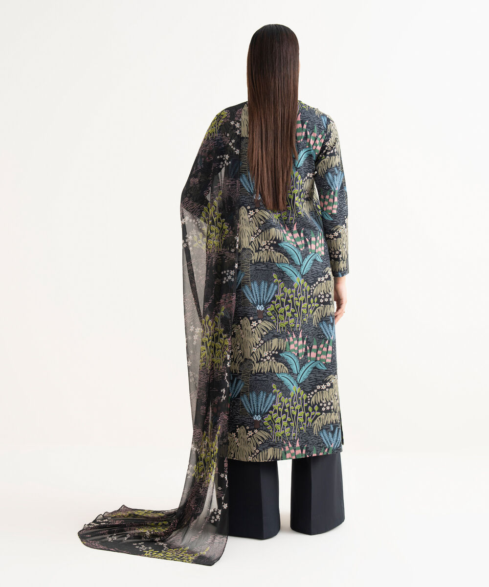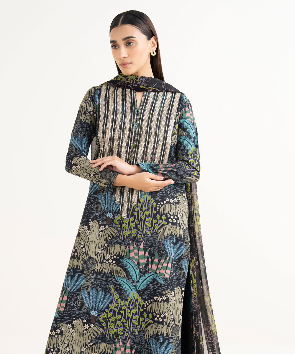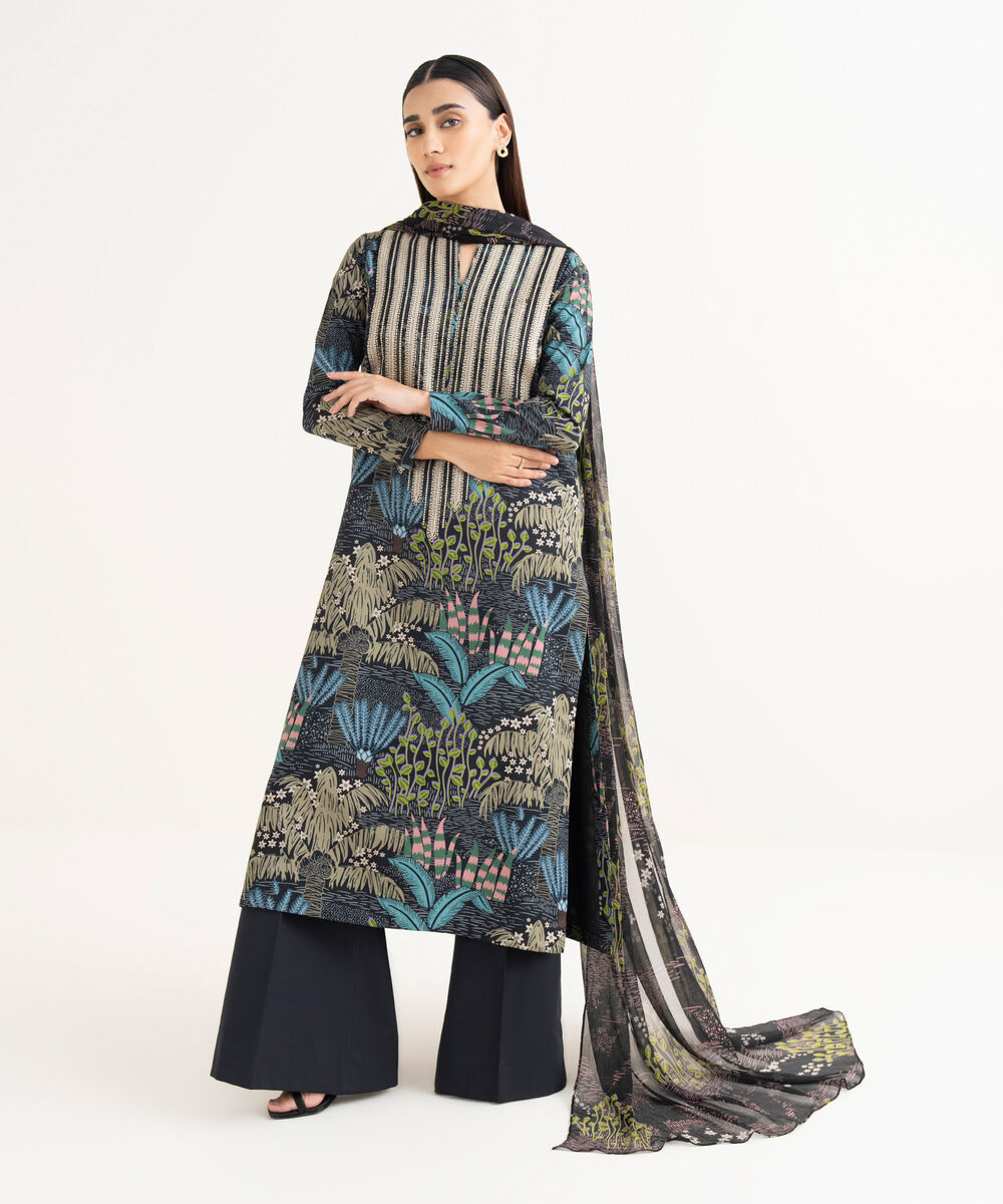 Make a statement with our three-piece embroidered black and blue ensemble featuring a lawn shirt paired with a blended chiffon dupatta and cotton trousers.