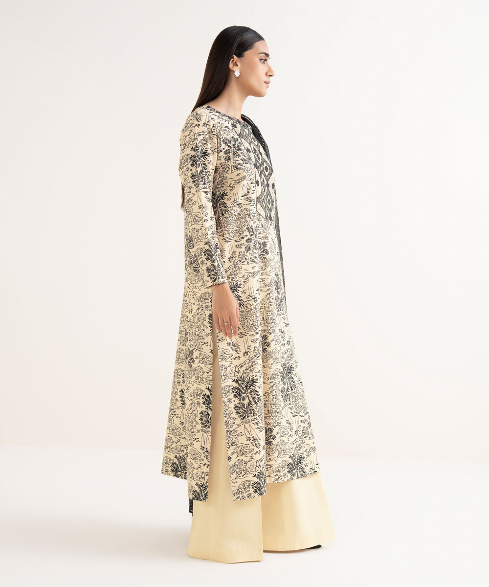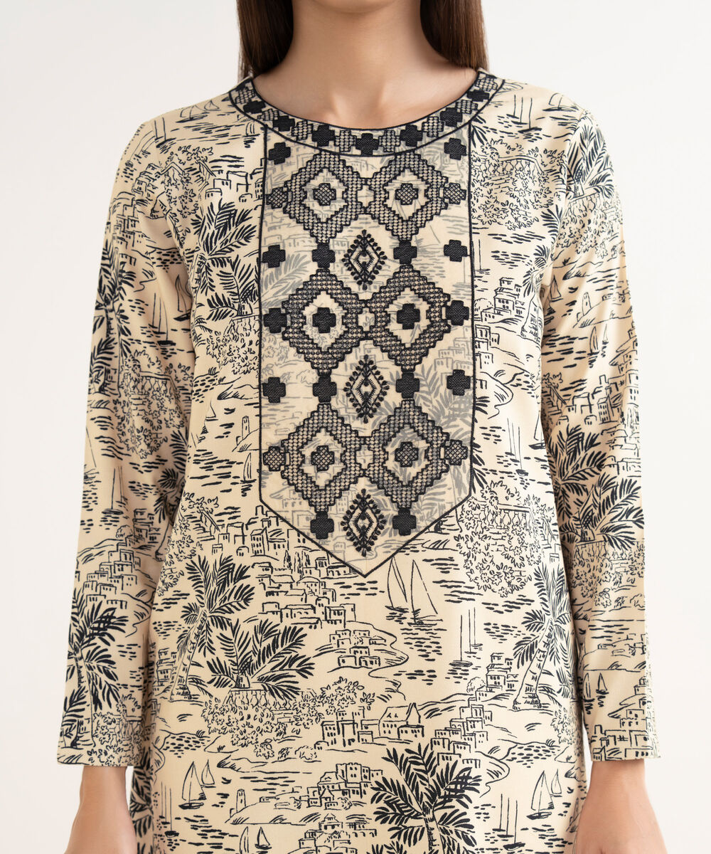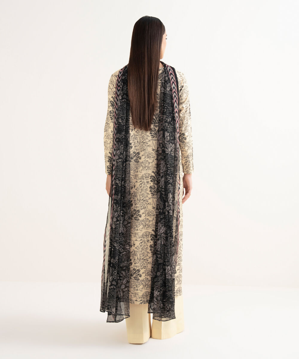 Make a statement with our three-piece embroidered beige and black ensemble featuring a lawn shirt paired with a blended chiffon dupatta and cotton trousers.