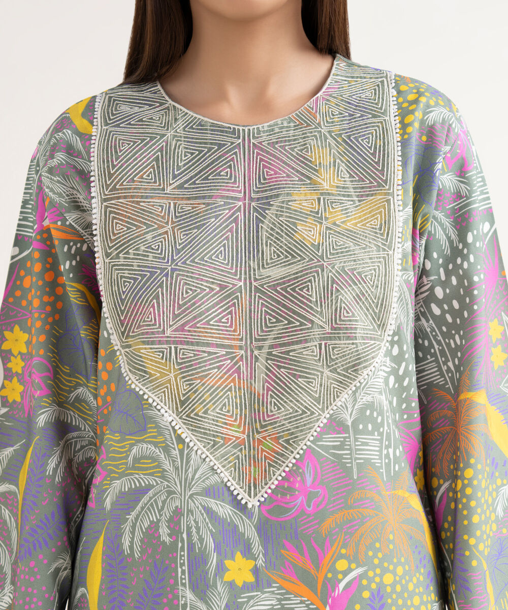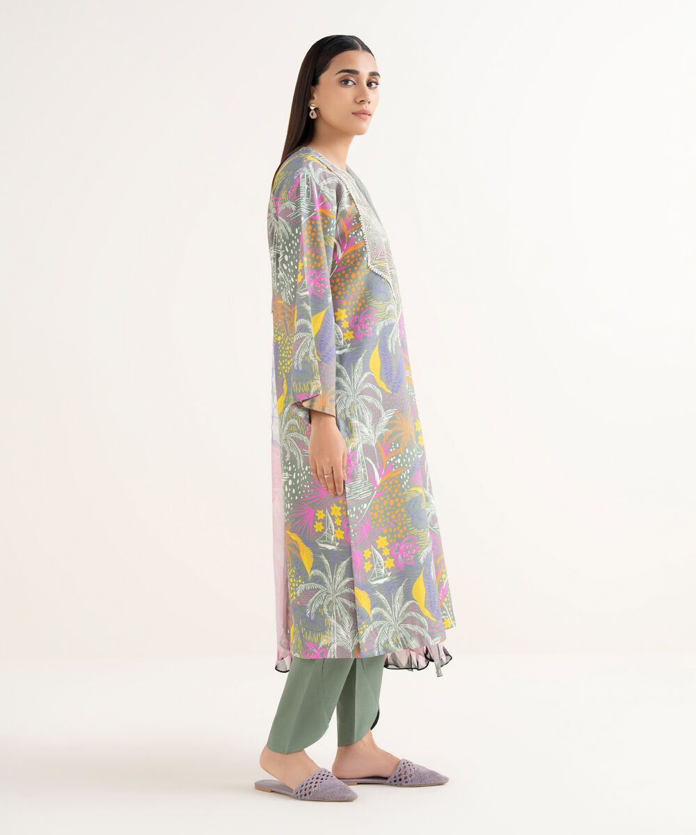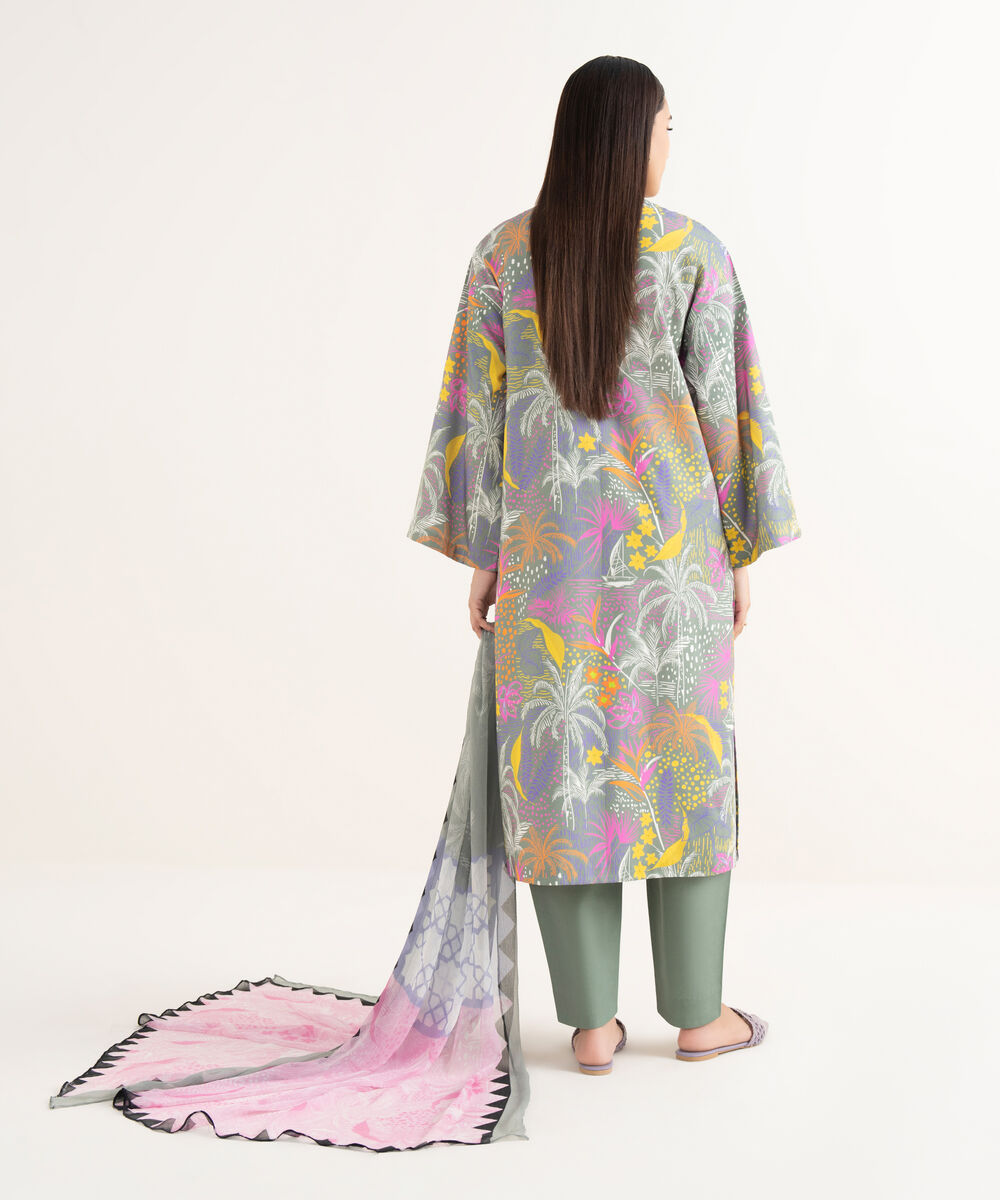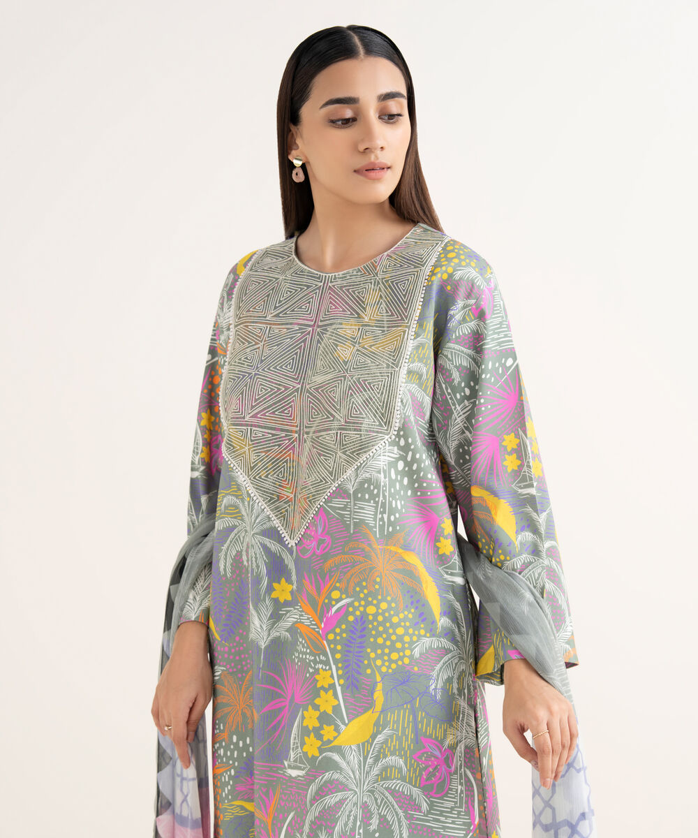 Make a statement with our three-piece embroidered multicoloured ensemble featuring a lawn shirt paired with a blended chiffon dupatta and cotton trousers.