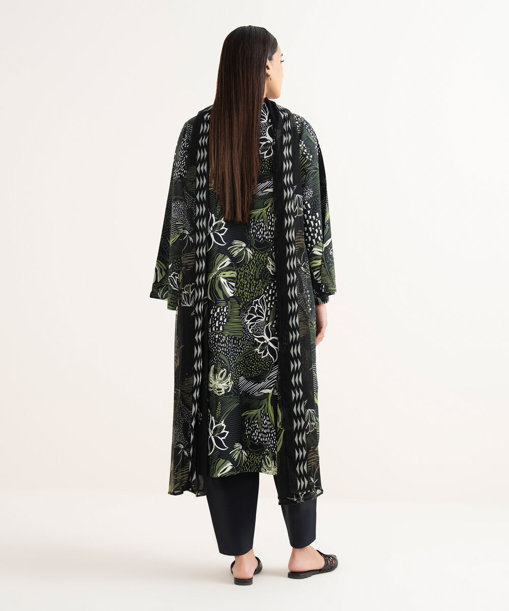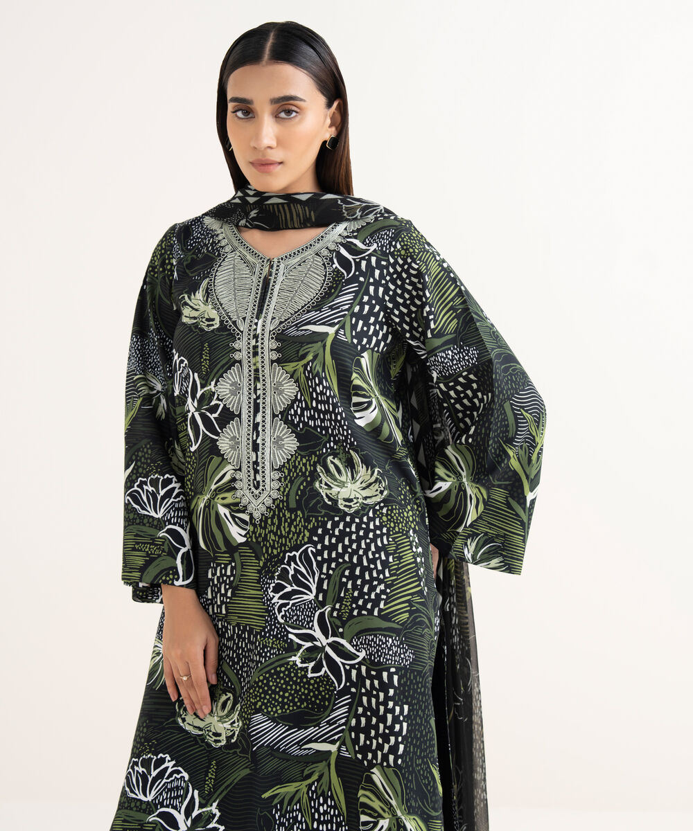 Make a statement with our three-piece embroidered black ensemble featuring a lawn shirt paired with a blended chiffon dupatta and cotton trousers.