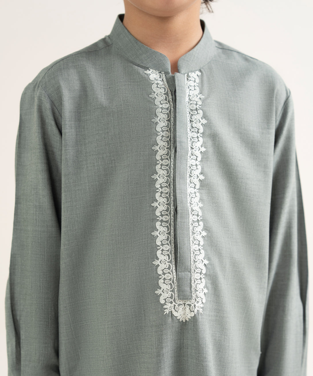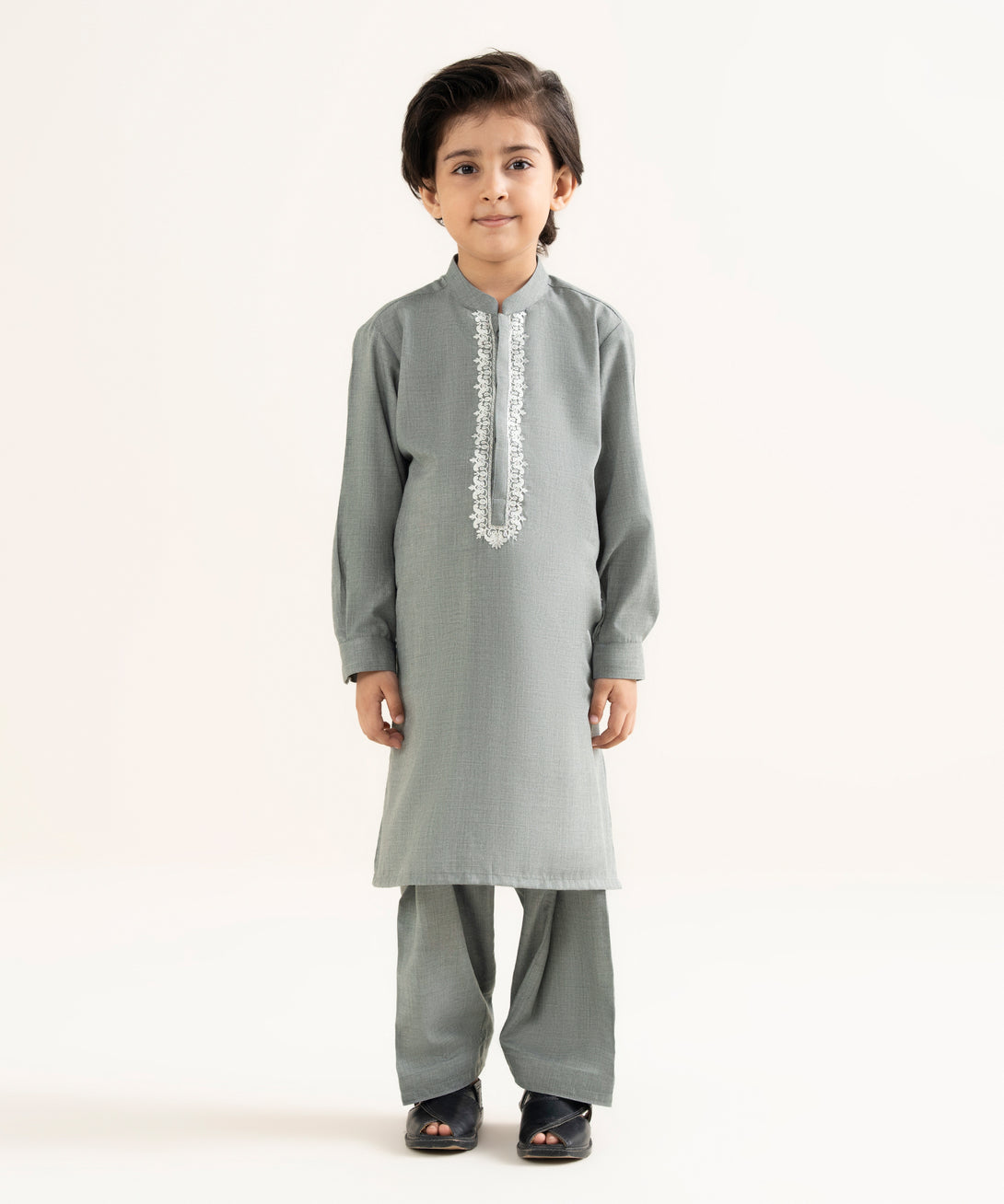 Make your little one stand out with our light grey embroidered kurta and shalwar.