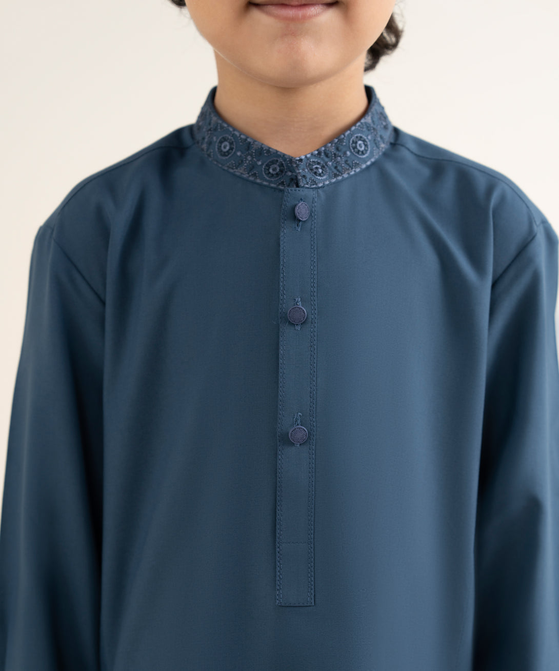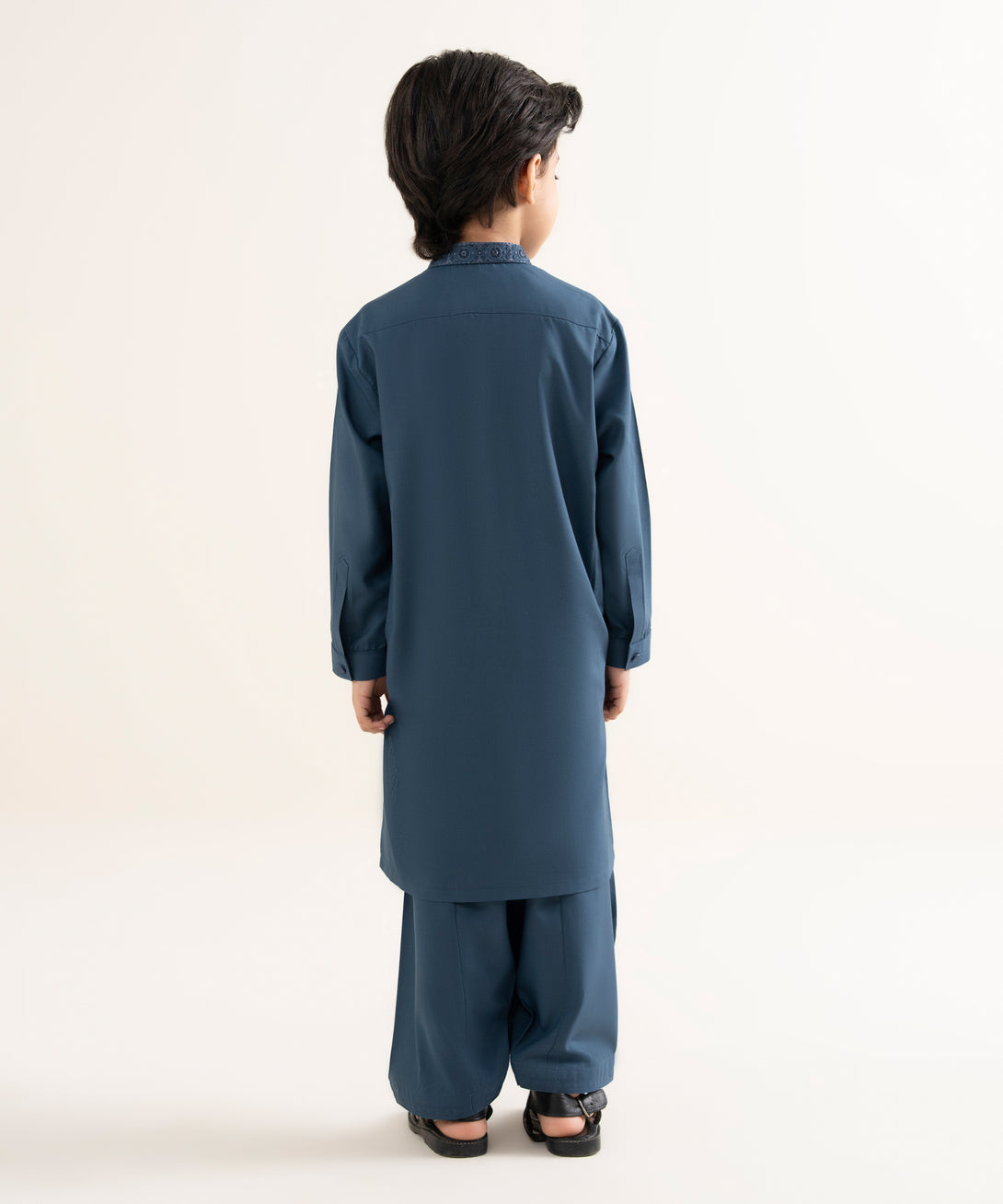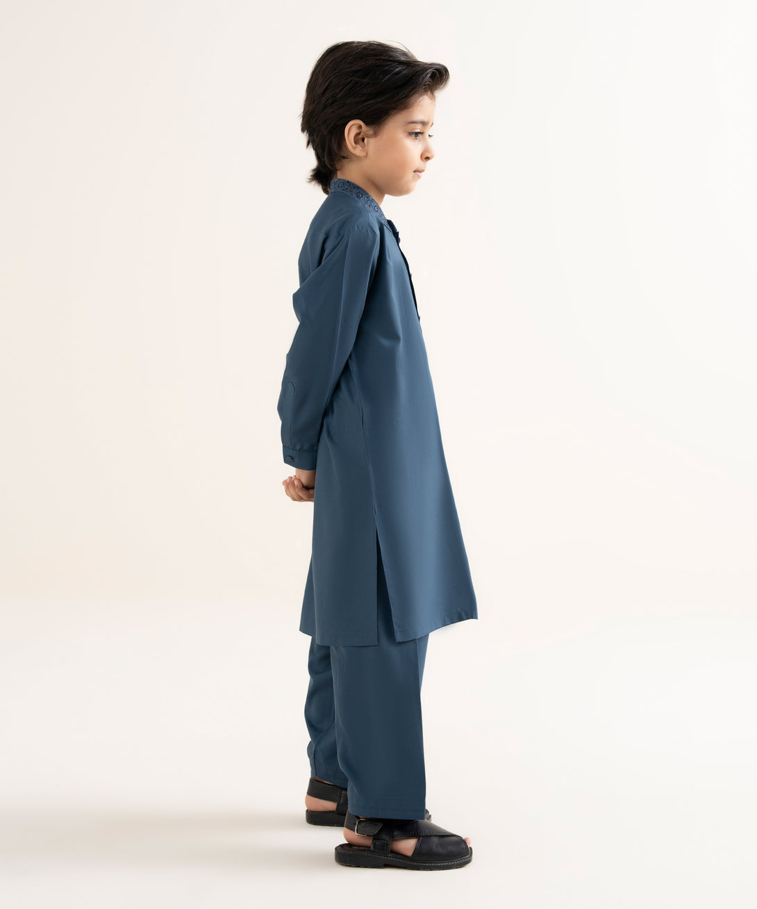 Make your little one stand out with our teal embroidered two-piece kurta shalwar.