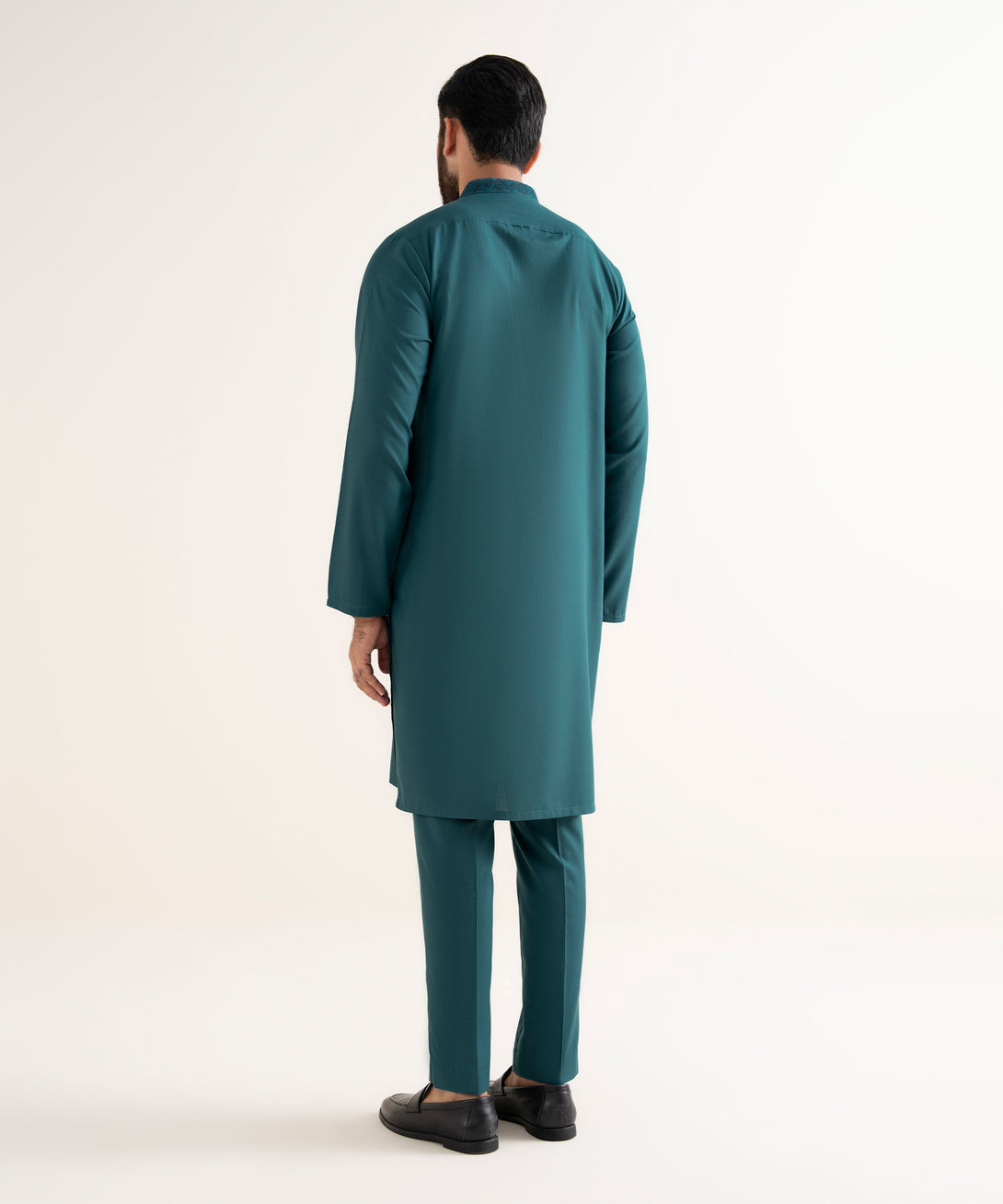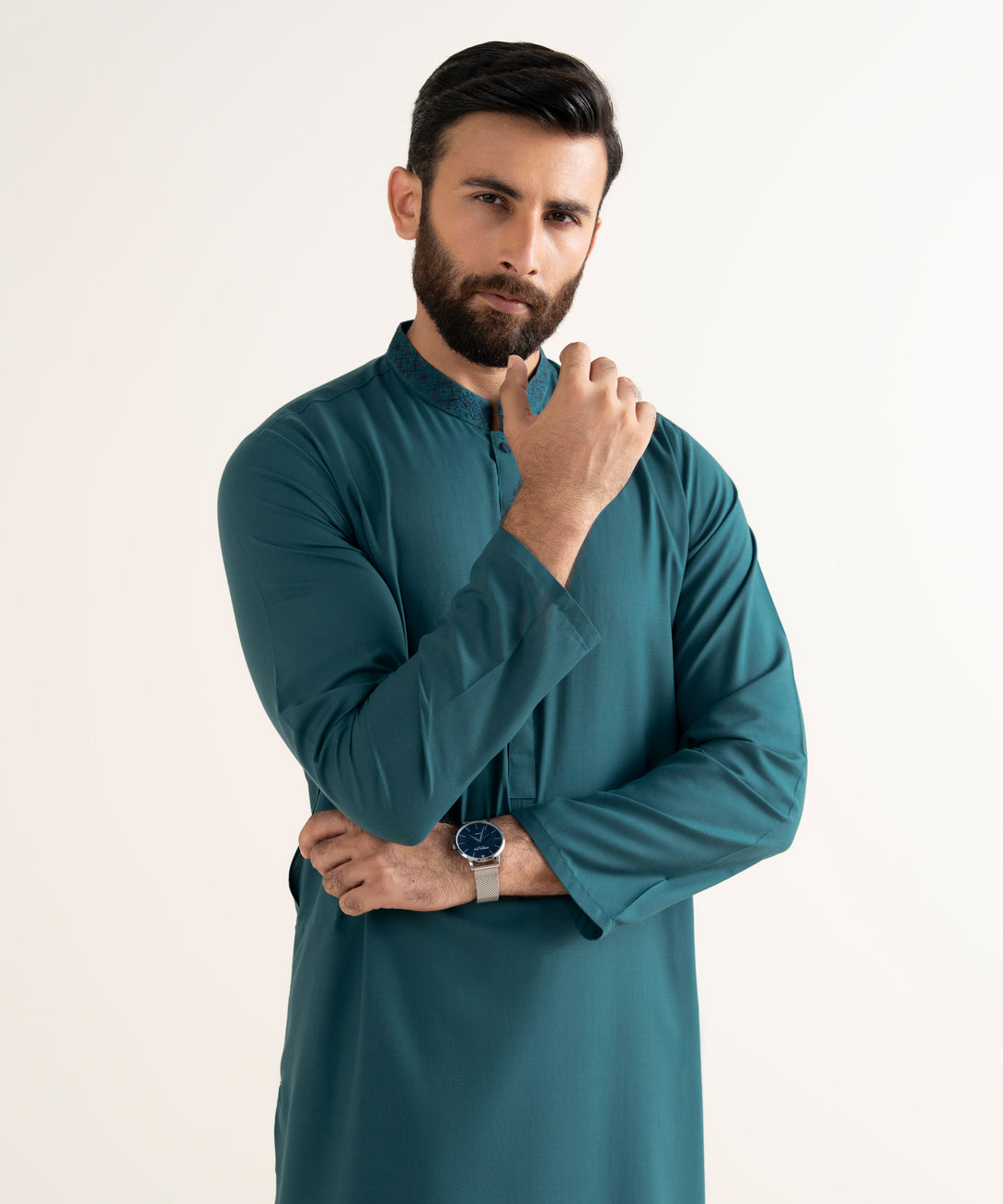 Make a dapper statement with our sage embroidered straight kurta and trousers.