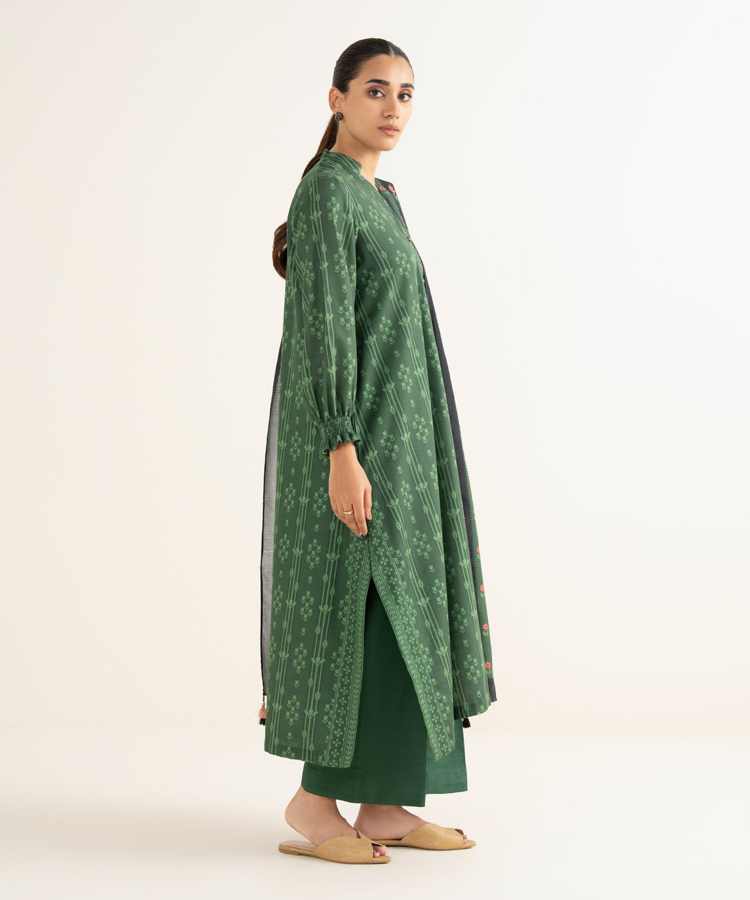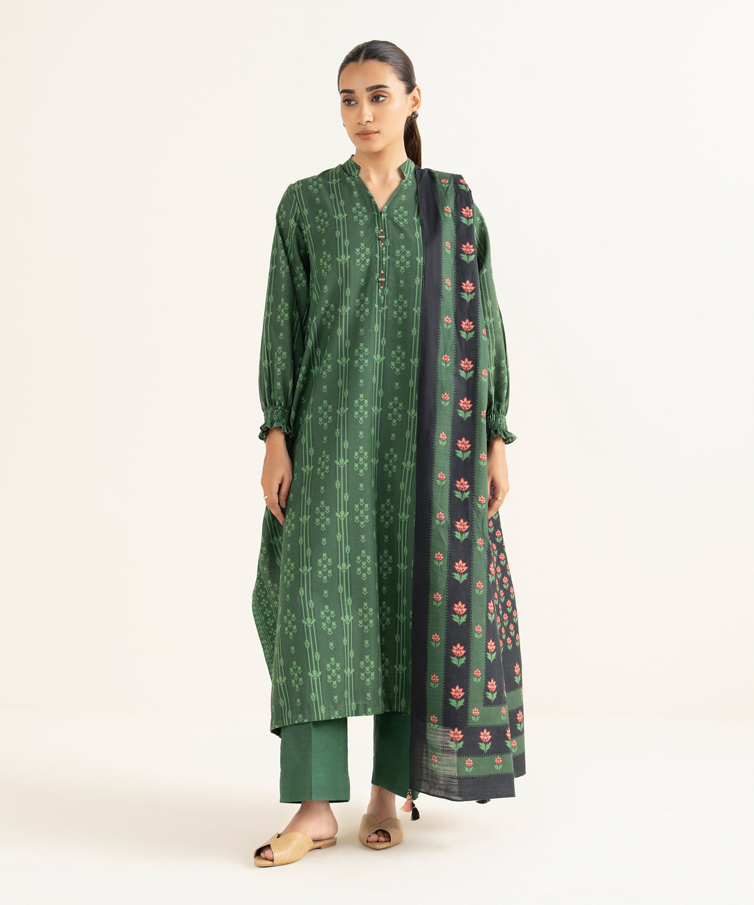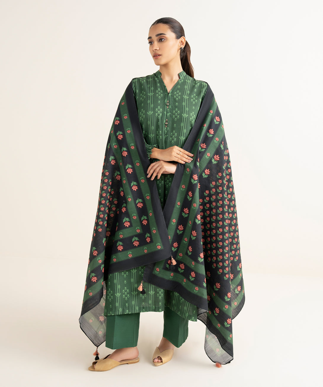 Make a statement with our two-piece printed green ensemble featuring a light khaddar shirt paired with a matching blended shawl.