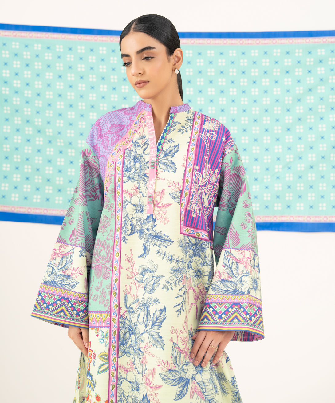 Make a statement with our two-piece printed ensemble featuring a khaddar shirt paired with a multicoloured blended dupatta.
