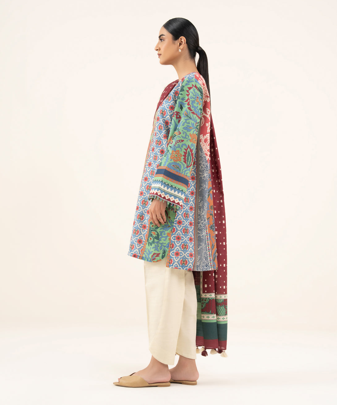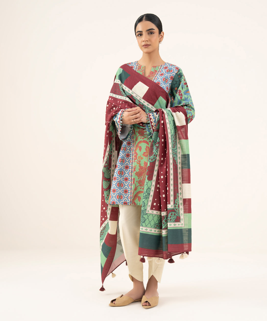 Make a statement with our two-piece printed ensemble featuring a multicoloured light khaddar shirt paired with a blended shawl.