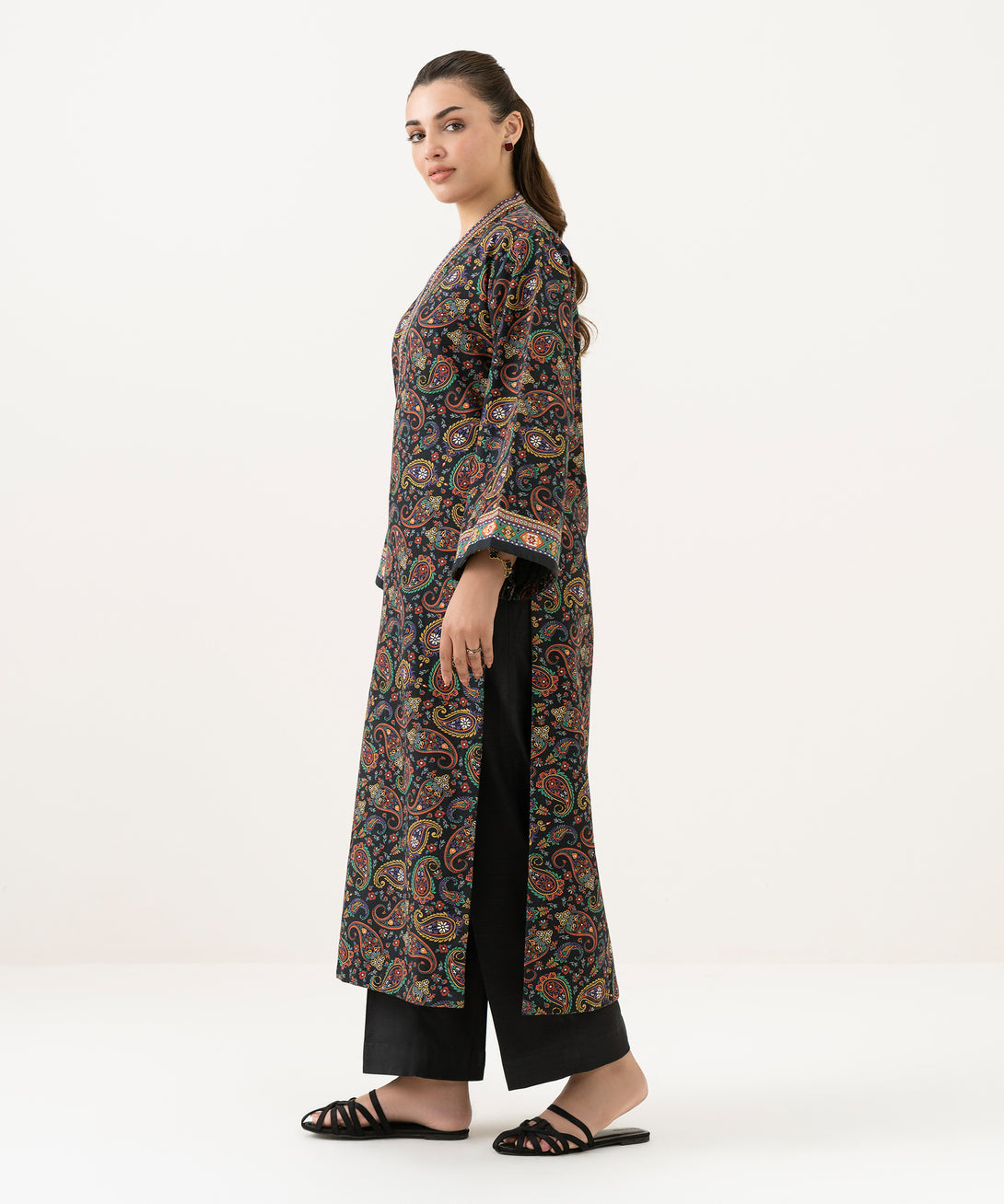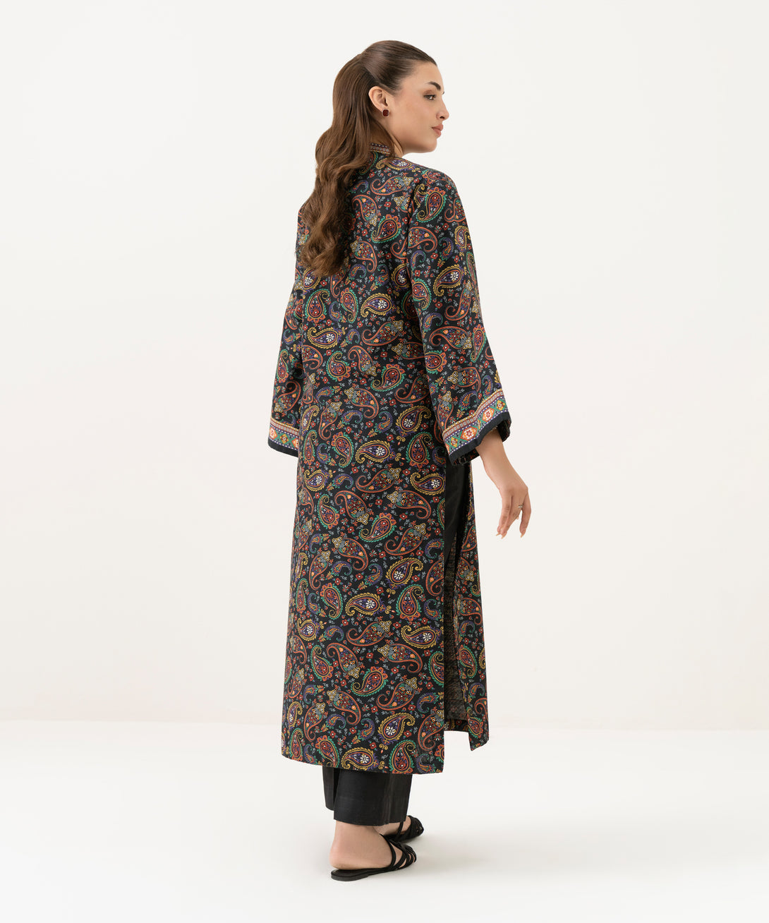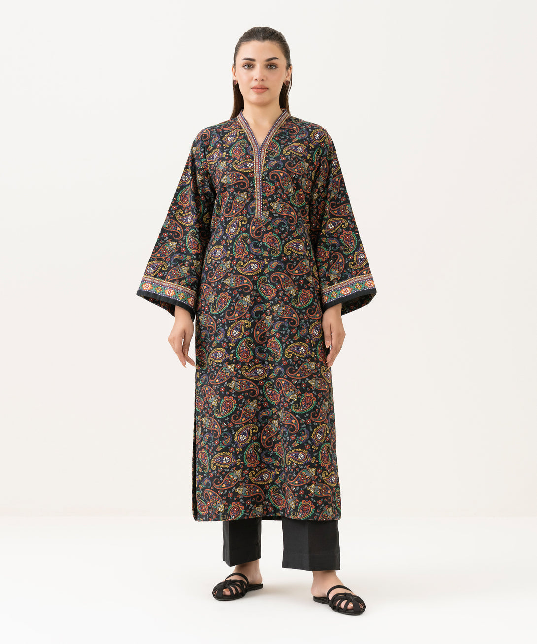 Elevate your style with our two-piece printed ensemble featuring a multicoloured khaddar shirt and black trousers.