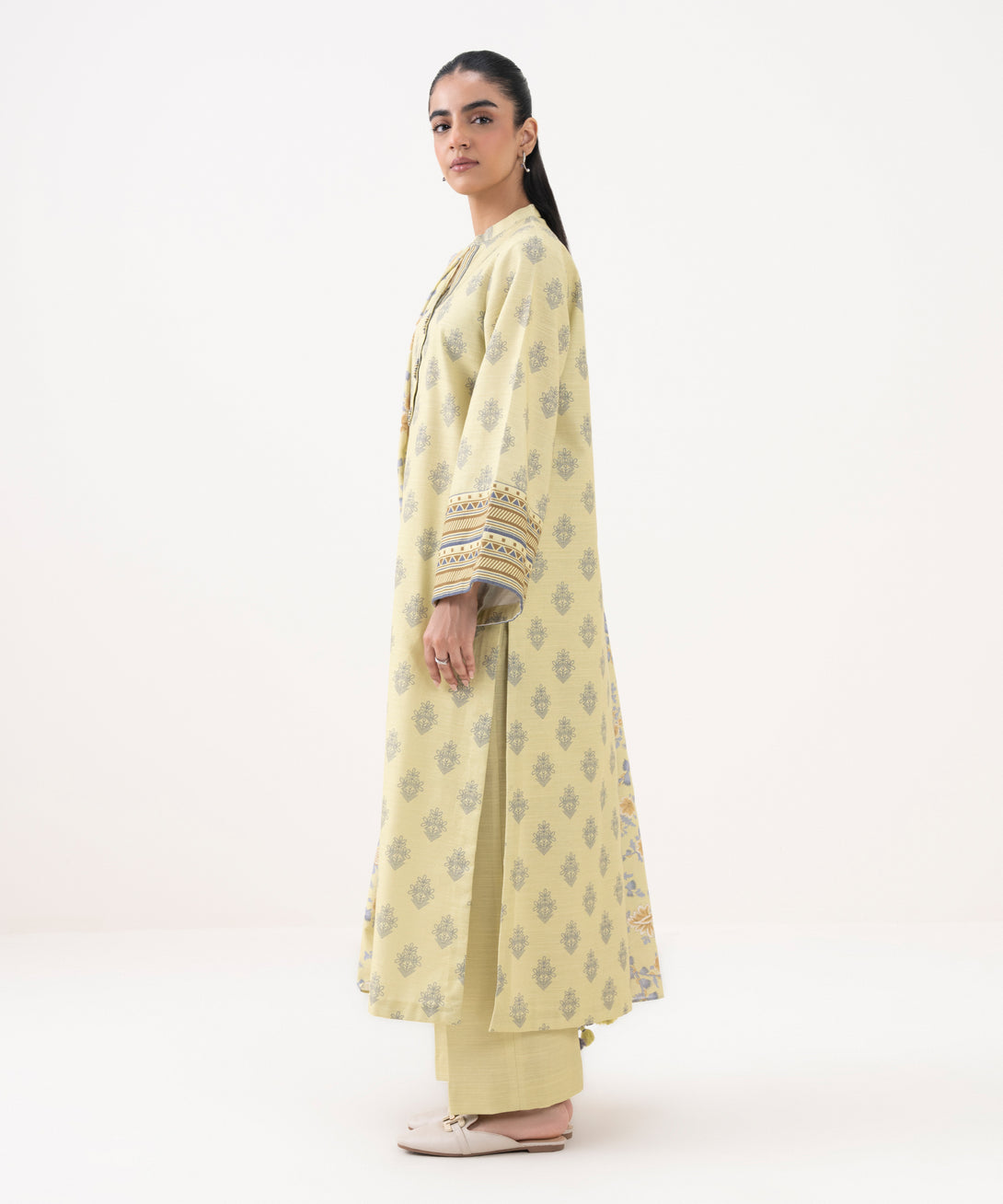 Make a statement with our three-piece printed ensemble featuring a khaddar shirt and trousers paired with a light khaddar dupatta.