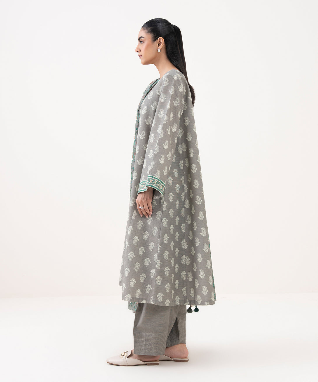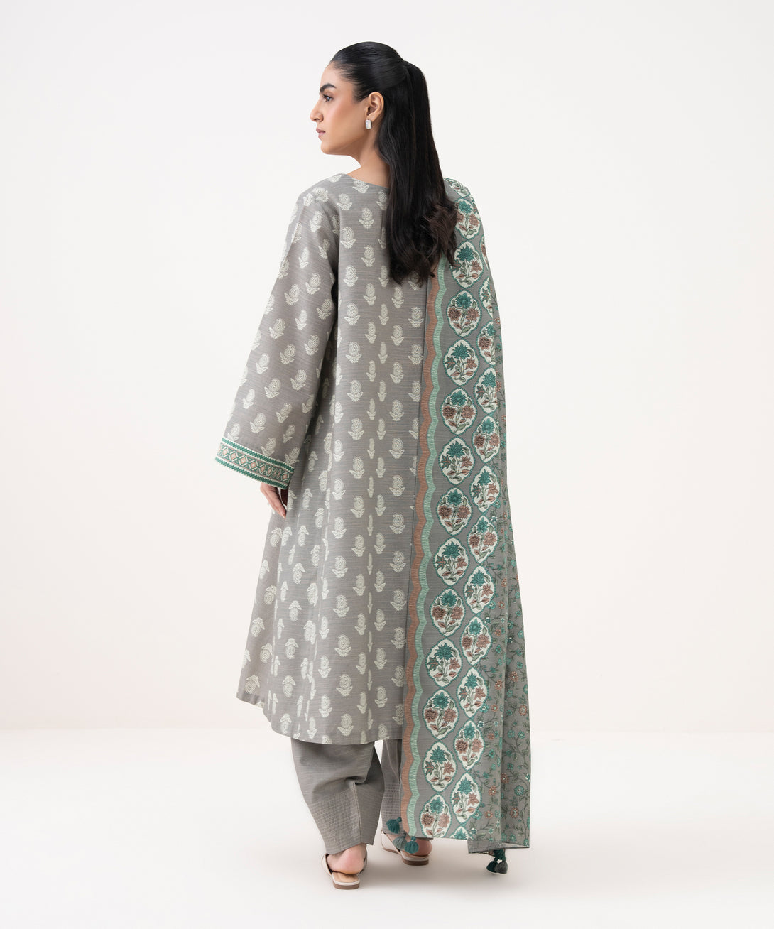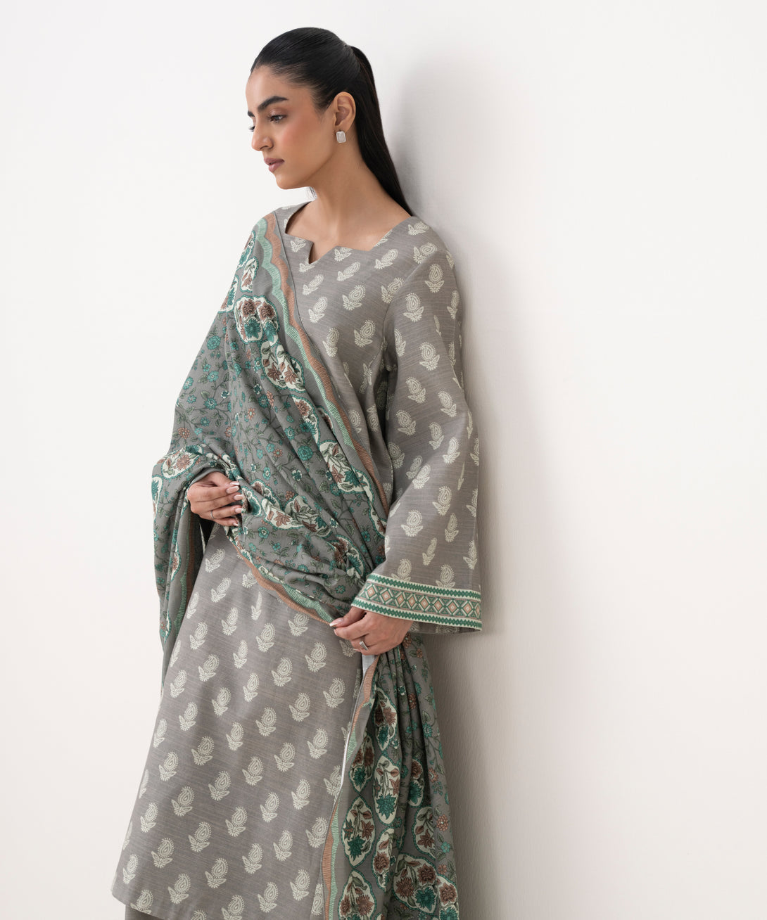 Make a statement with our three-piece printed ensemble featuring a khaddar shirt and trousers paired with a light khaddar dupatta.
