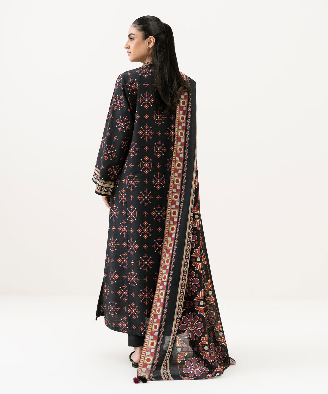 Make a statement with our three-piece printed black and rust ensemble featuring a khaddar shirt and trousers paired with a light khaddar dupatta.