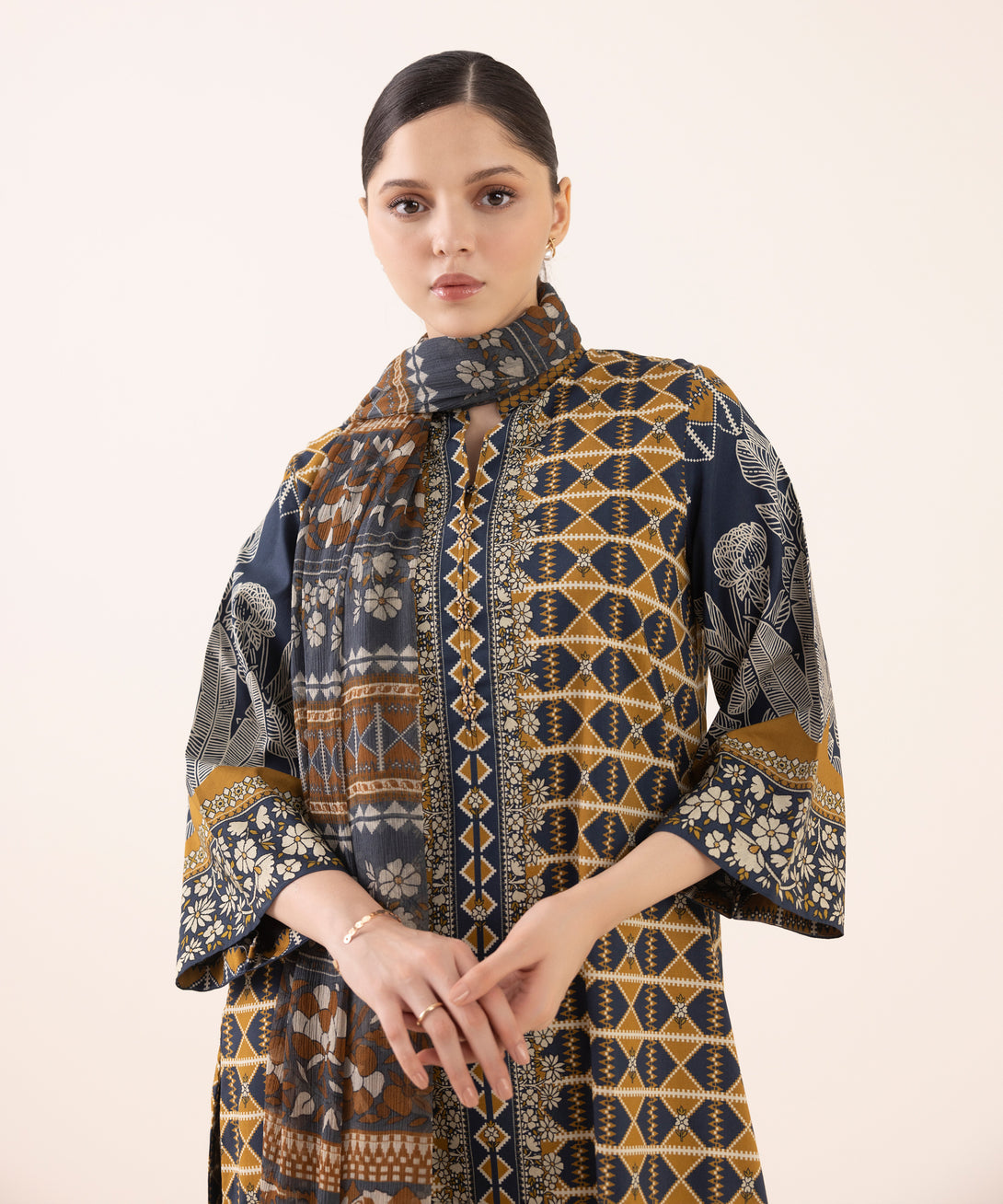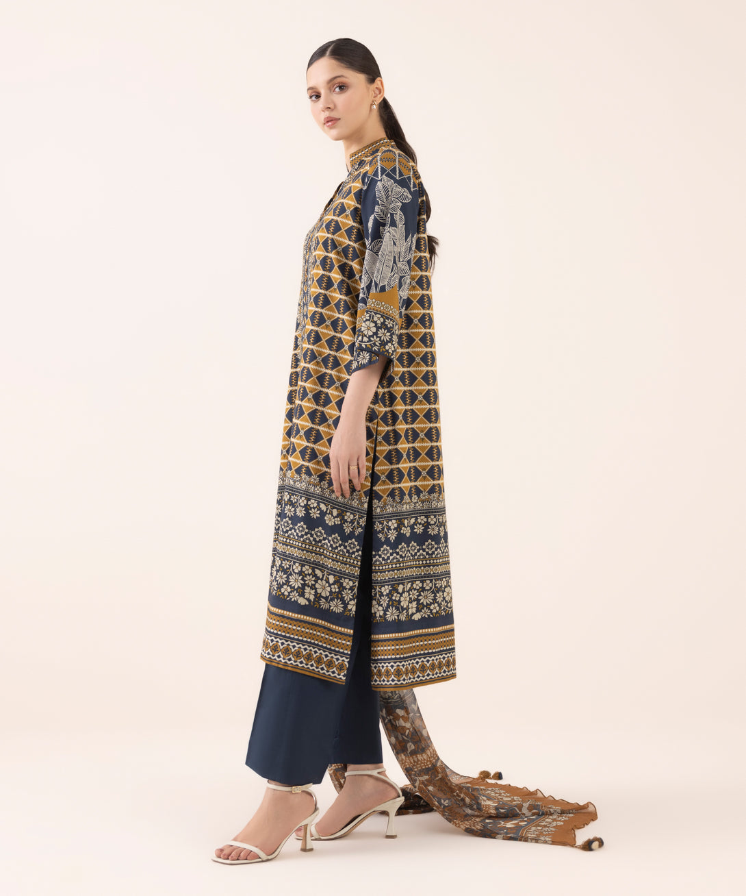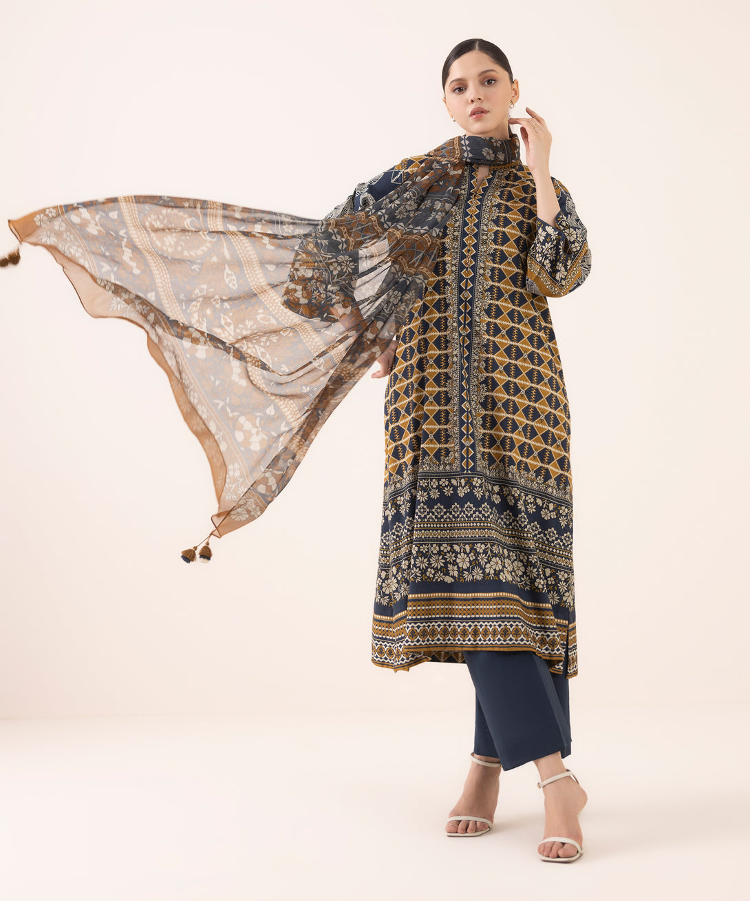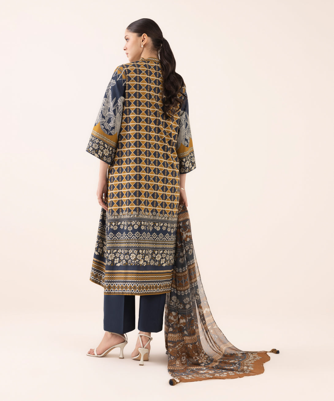 Elevate your style with our three-piece printed ensemble featuring a light linen shirt paired with a blended chiffon dupatta and cotton trousers.