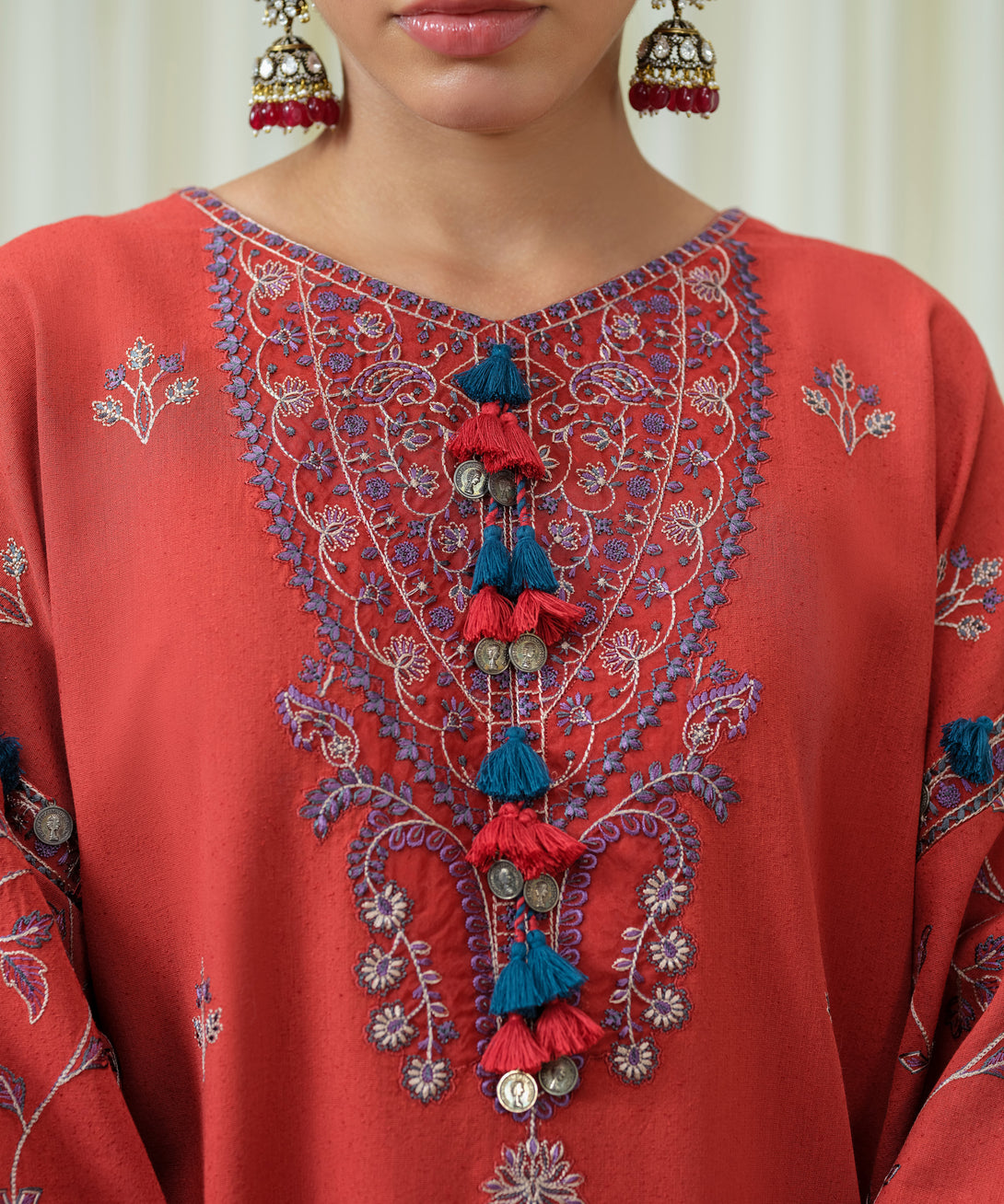 Make a statement with our three-piece embroidered rust ensemble featuring a cotton karandi shirt and trousers paired with a matching dupatta.