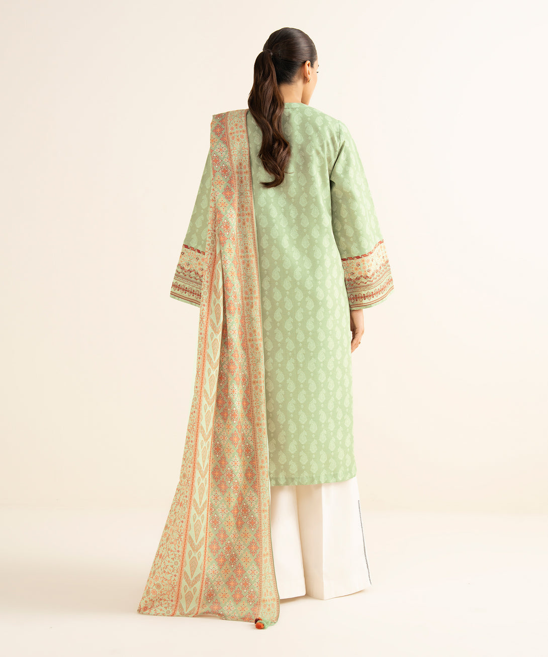 Make a statement with our two-piece embroidered pistachio ensemble featuring a cotton shirt paired with a voile dupatta.