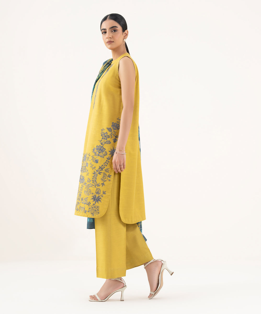 Elevate your style with our three-piece embroidered mustard ensemble featuring a cotton shirt and trousers paired with a matching dupatta.