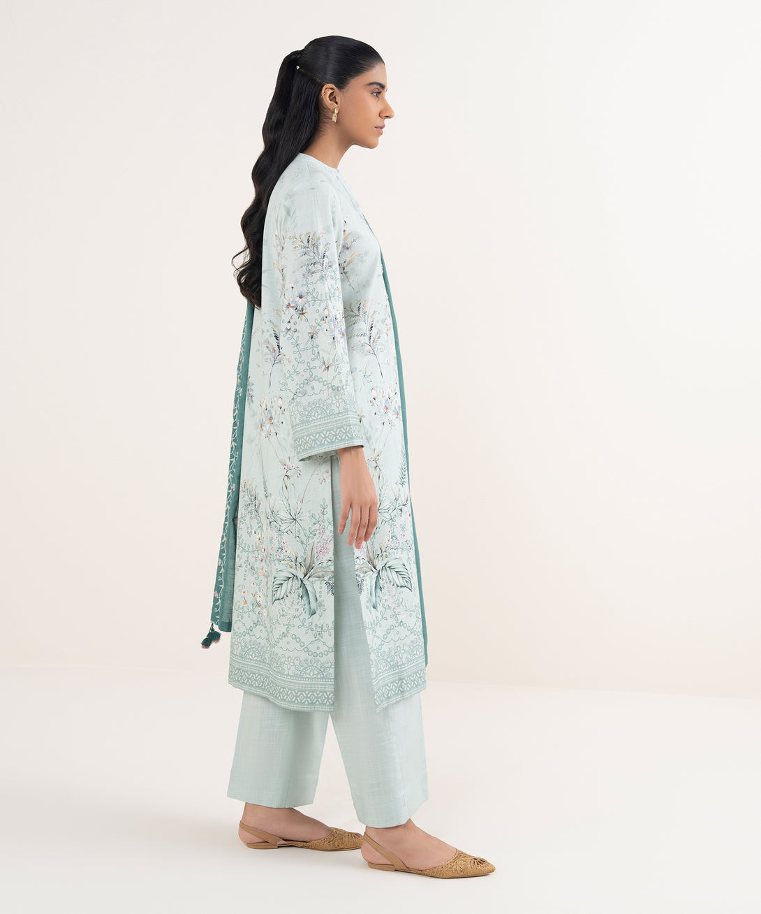 Make a statement with our three-piece aqua and green ensemble featuring a crosshatch shirt and trousers paired with an embroidered light khaddar dupatta.