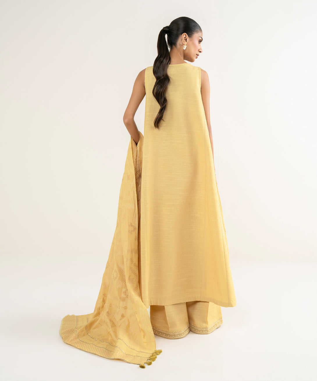 Make a statement with our three-piece embroidered ensemble featuring a zari khaddar shirt and trousers paired with an extra-weft jacquard dupatta.