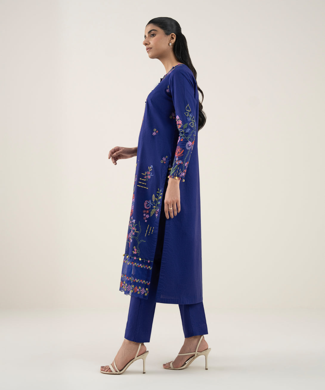 Elevate your style with our three-piece embroidered ensemble featuring a textured lawn shirt paired with a blended chiffon dupatta and cotton trousers.