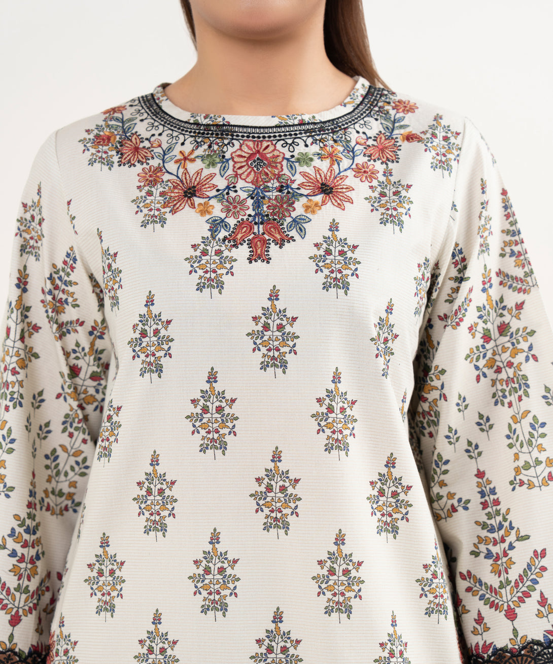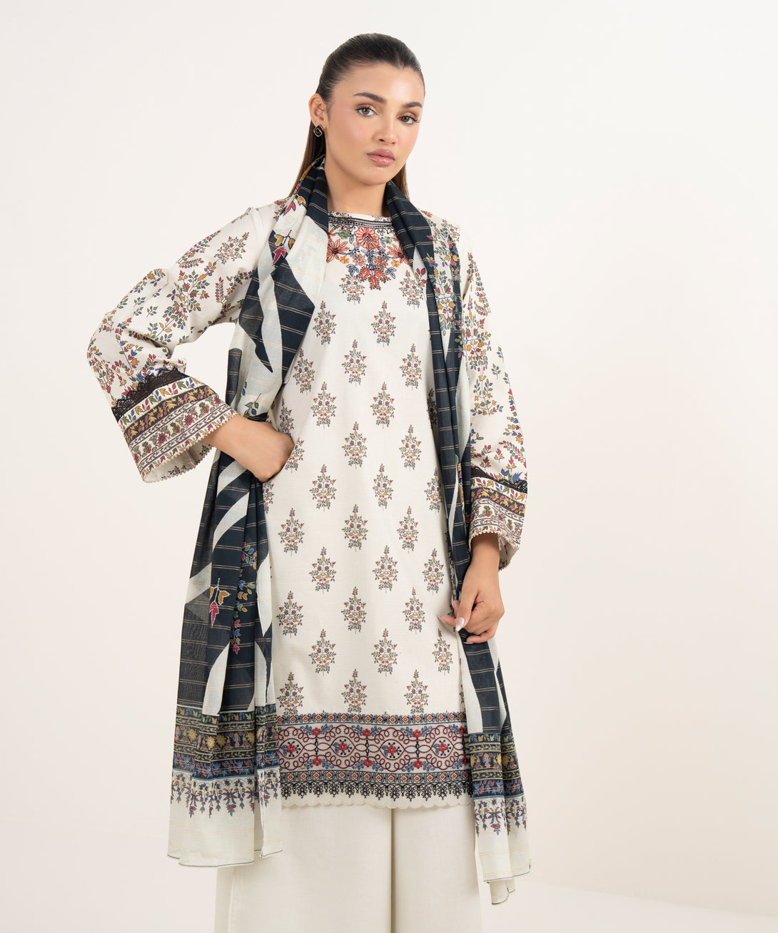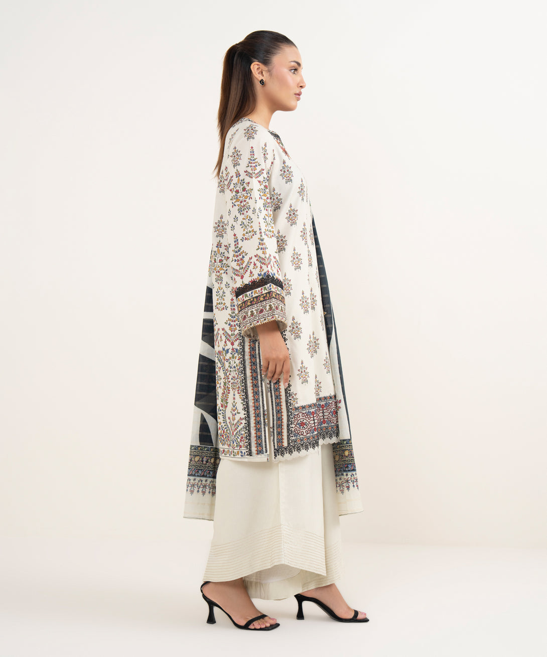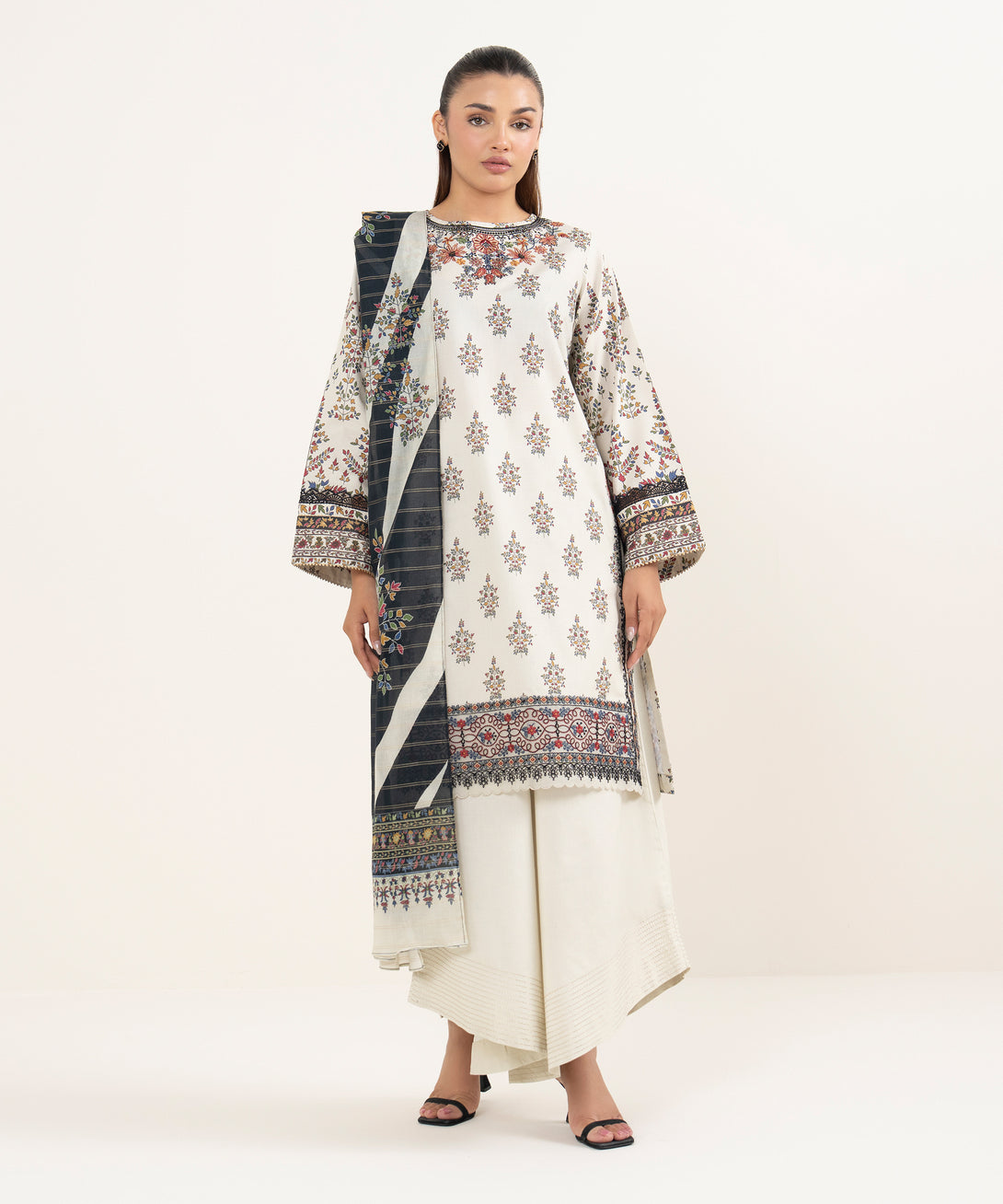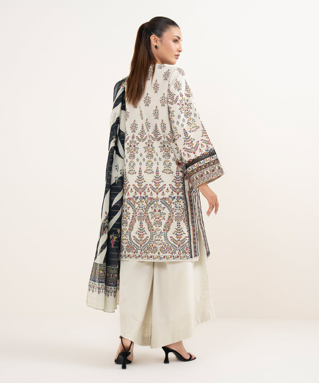 Elevate your style with our three-piece embroidered ensemble featuring a textured cotton shirt paired with a bemberg chiffon dupatta and cotton trousers.