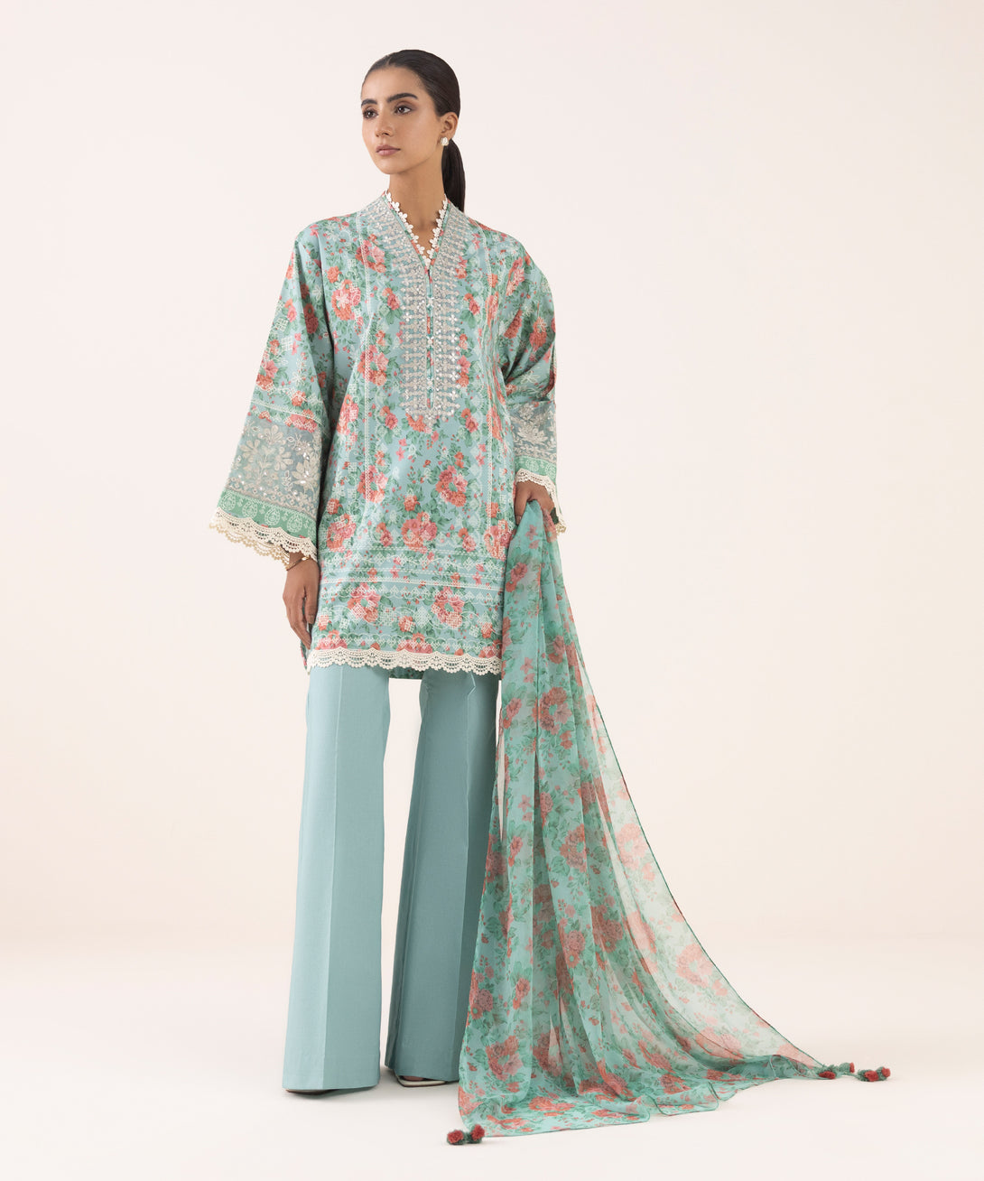 Make a statement with our three-piece embroidered ensemble featuring a cotton viscose shirt and trousers paired with a blended chiffon dupatta.