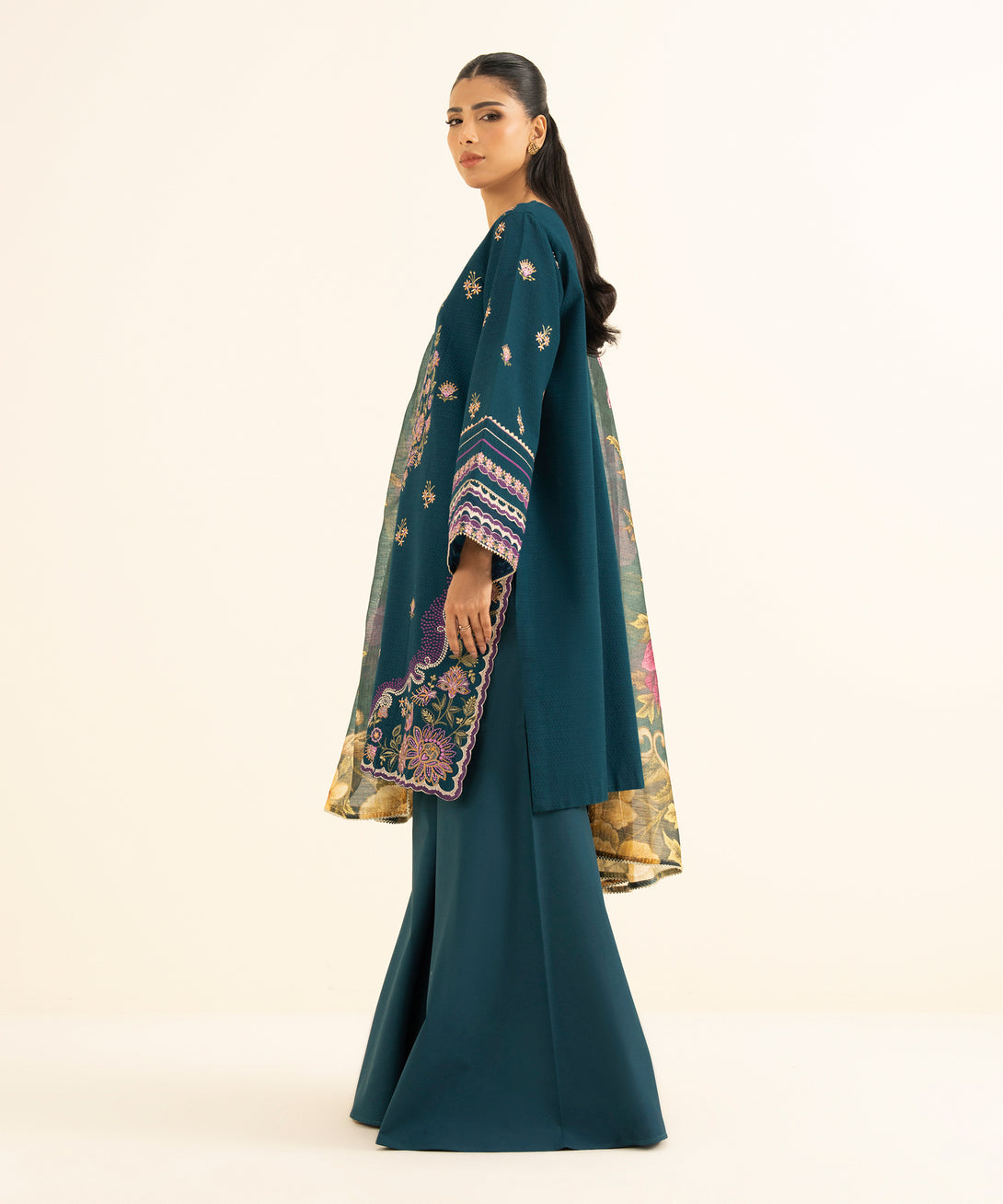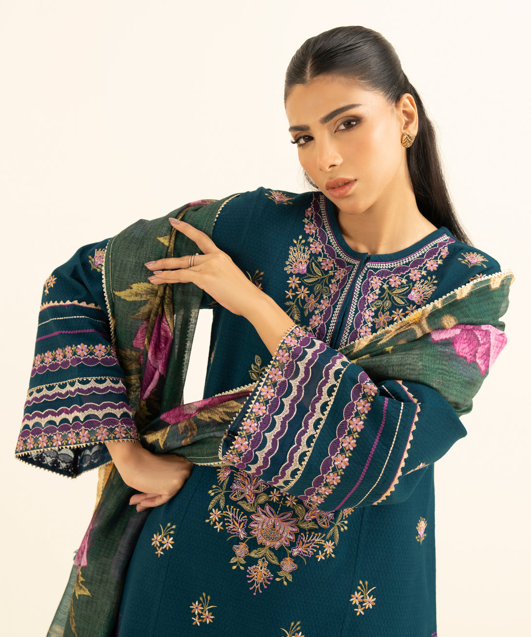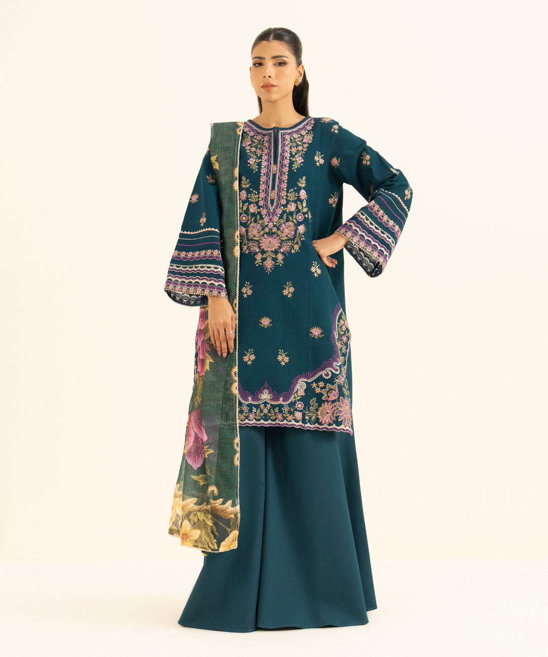 Make a statement with our three-piece embroidered teal blue ensemble featuring a dobby shirt paired with a manaar dupatta and cotton trousers.