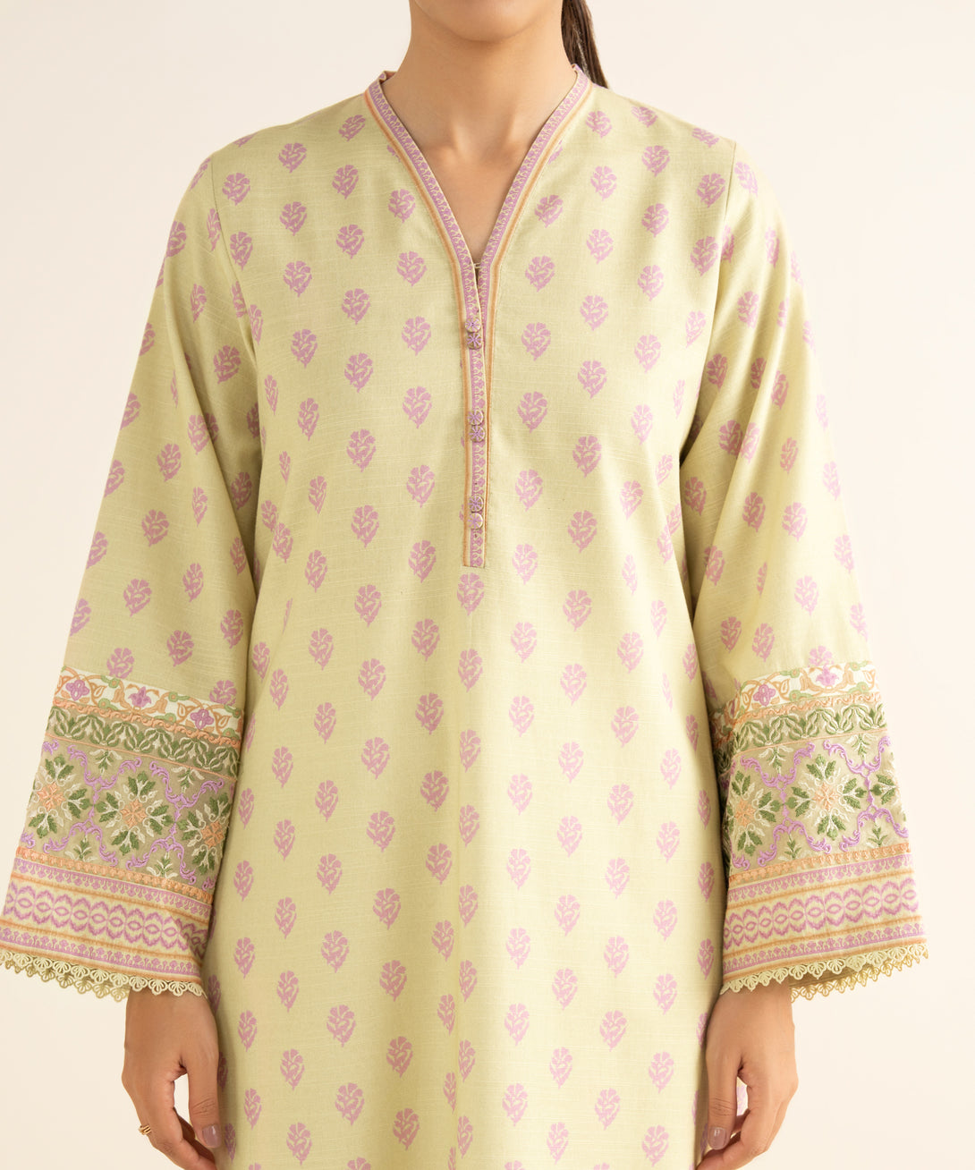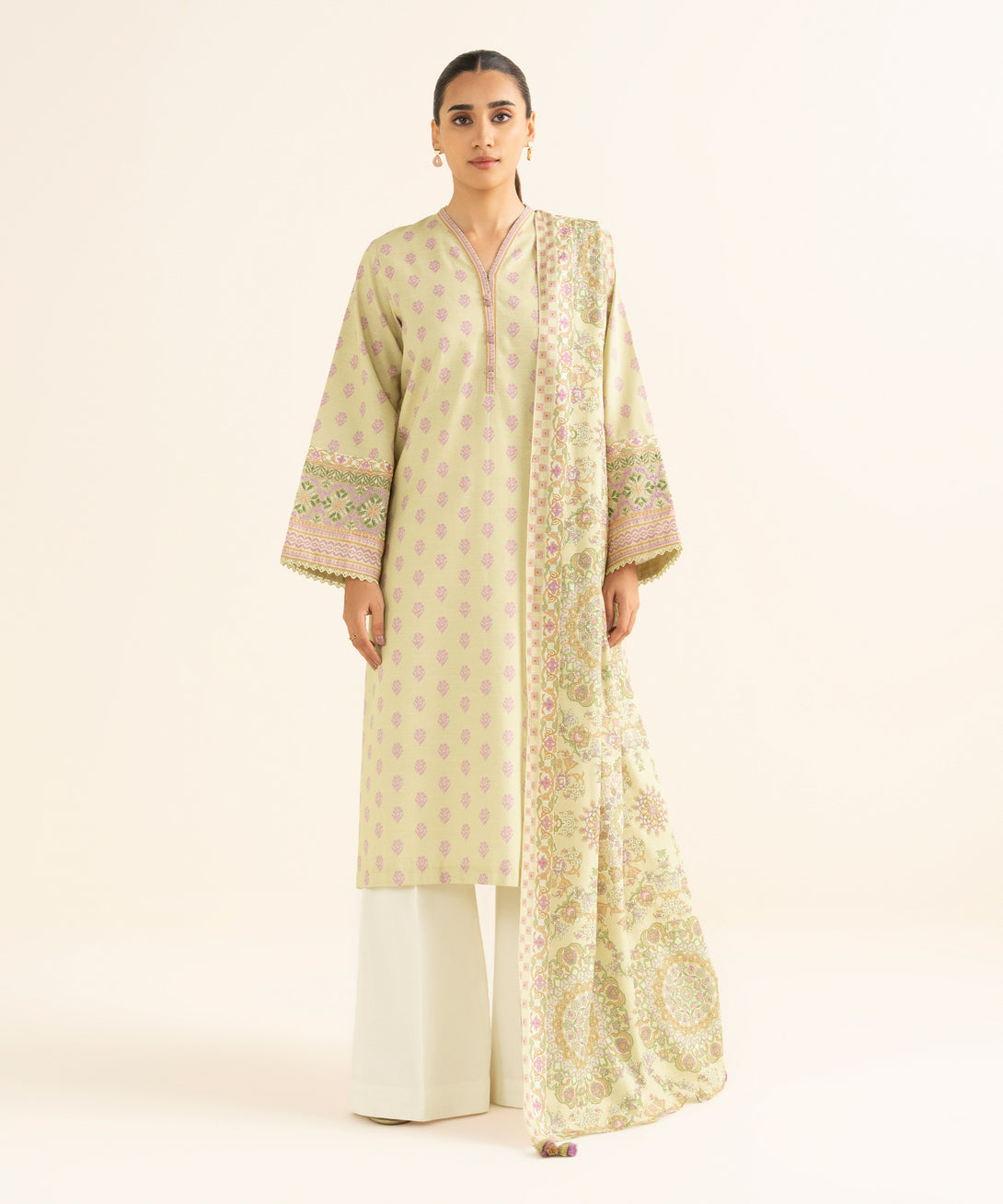 Elevate your style with our two-piece embroidered pale yellow ensemble featuring a light khaddar shirt paired with a matching dupatta.