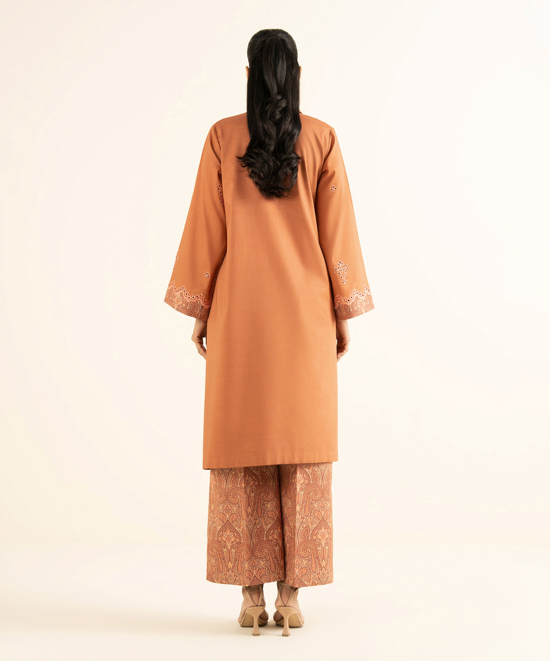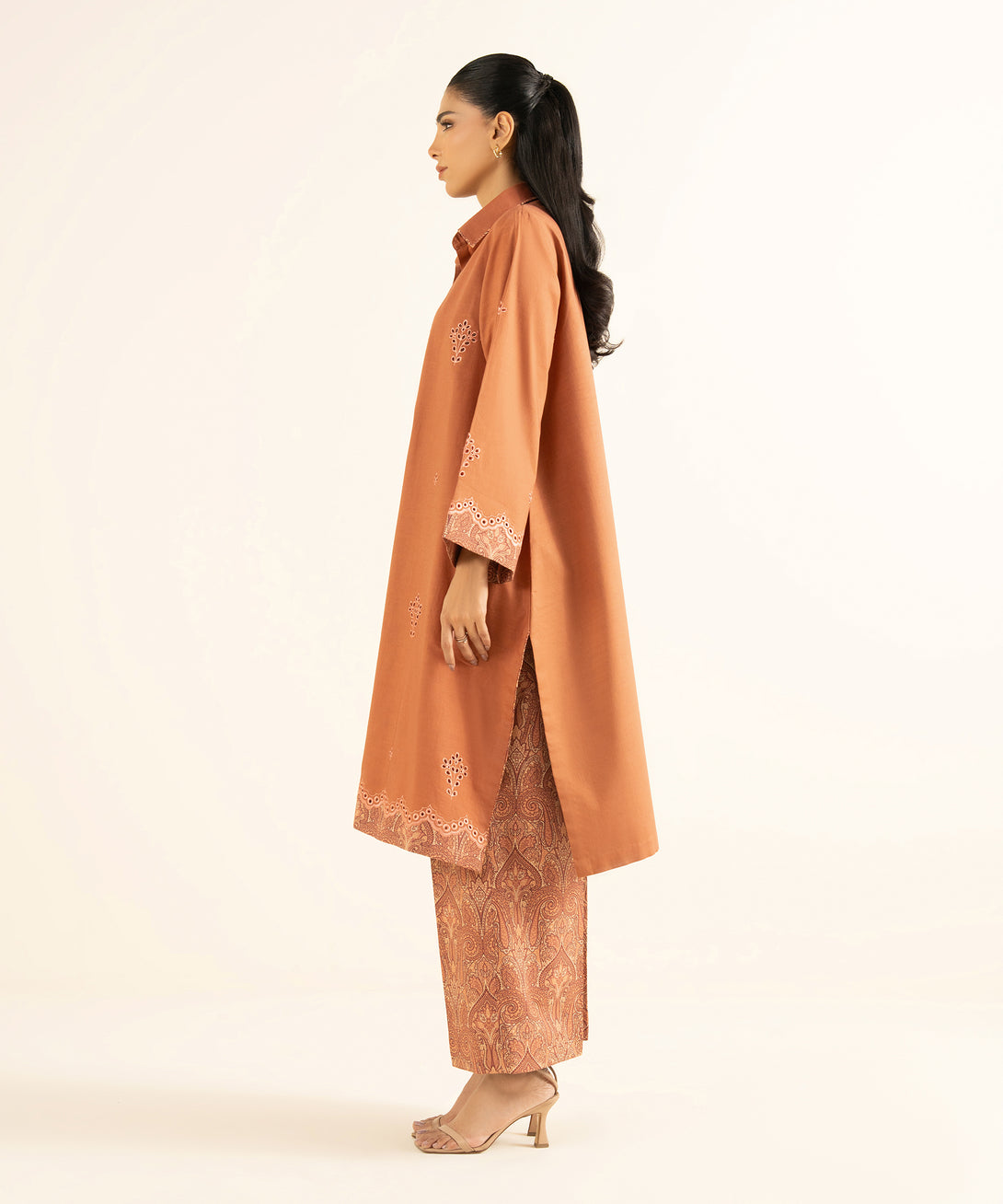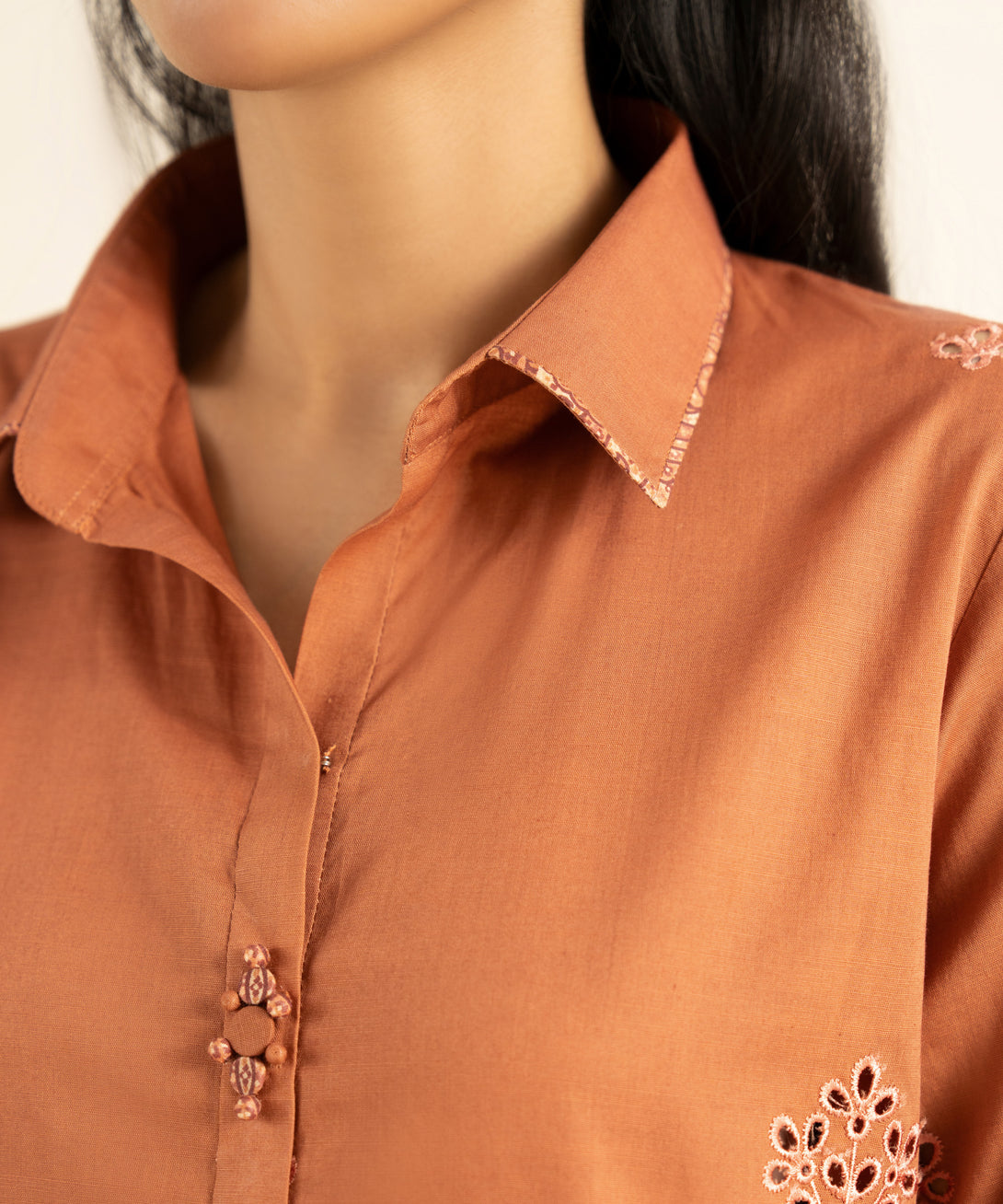 Elevate your style with our two-piece embroidered rust ensemble featuring a textured cotton shirt paired with cotton trousers.