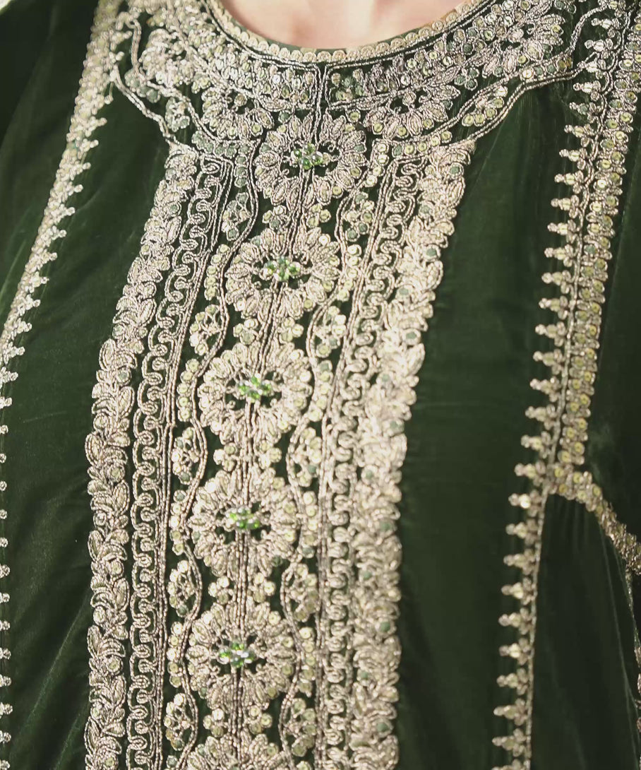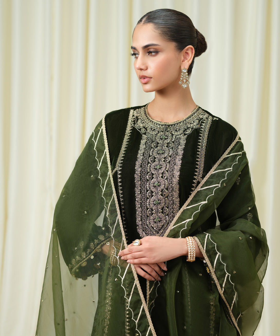 Elevate your style with our three-piece formal ensemble featuring a velvet shirt paired with a blended organza dupatta and raw silk trousers.