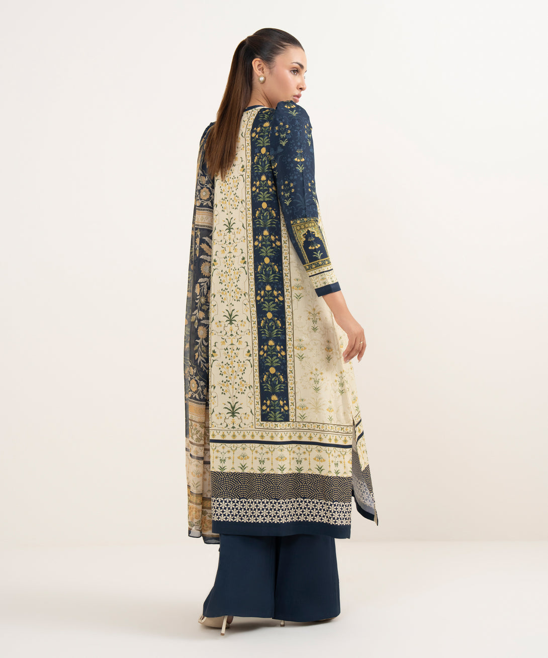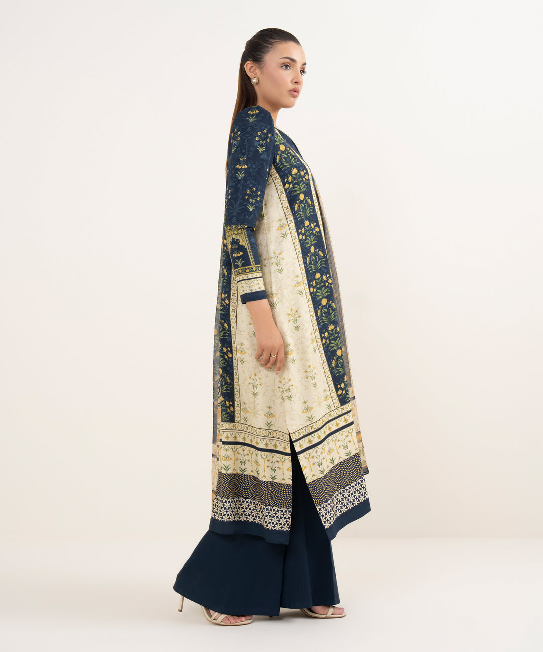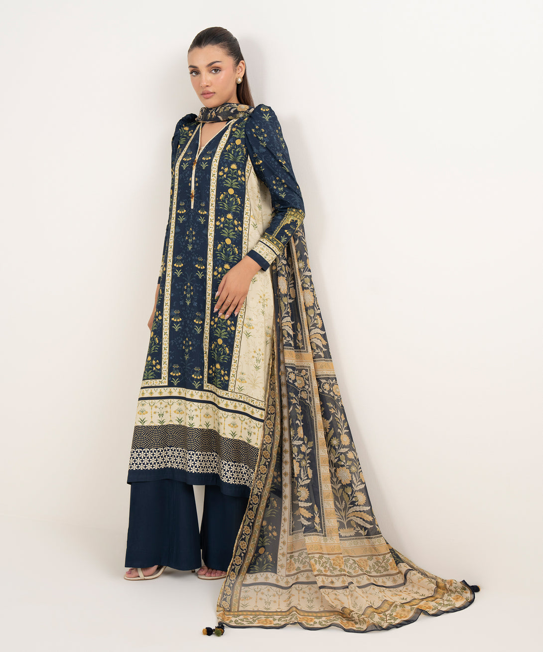 Make a statement with our three-piece printed ensemble featuring a linen shirt and trousers paired with a textured voile dupatta.