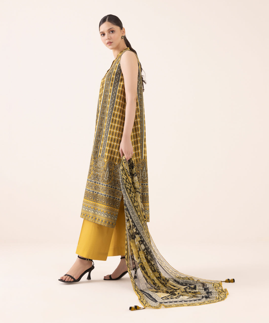 Elevate your style with our three-piece printed ensemble featuring a light linen shirt paired with a blended chiffon dupatta and cotton trousers.