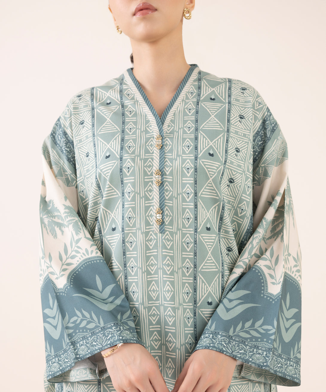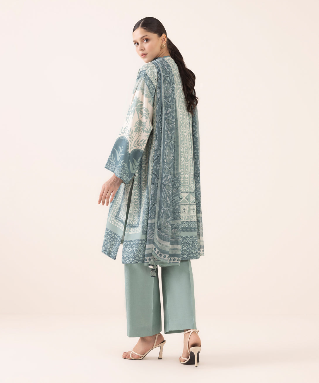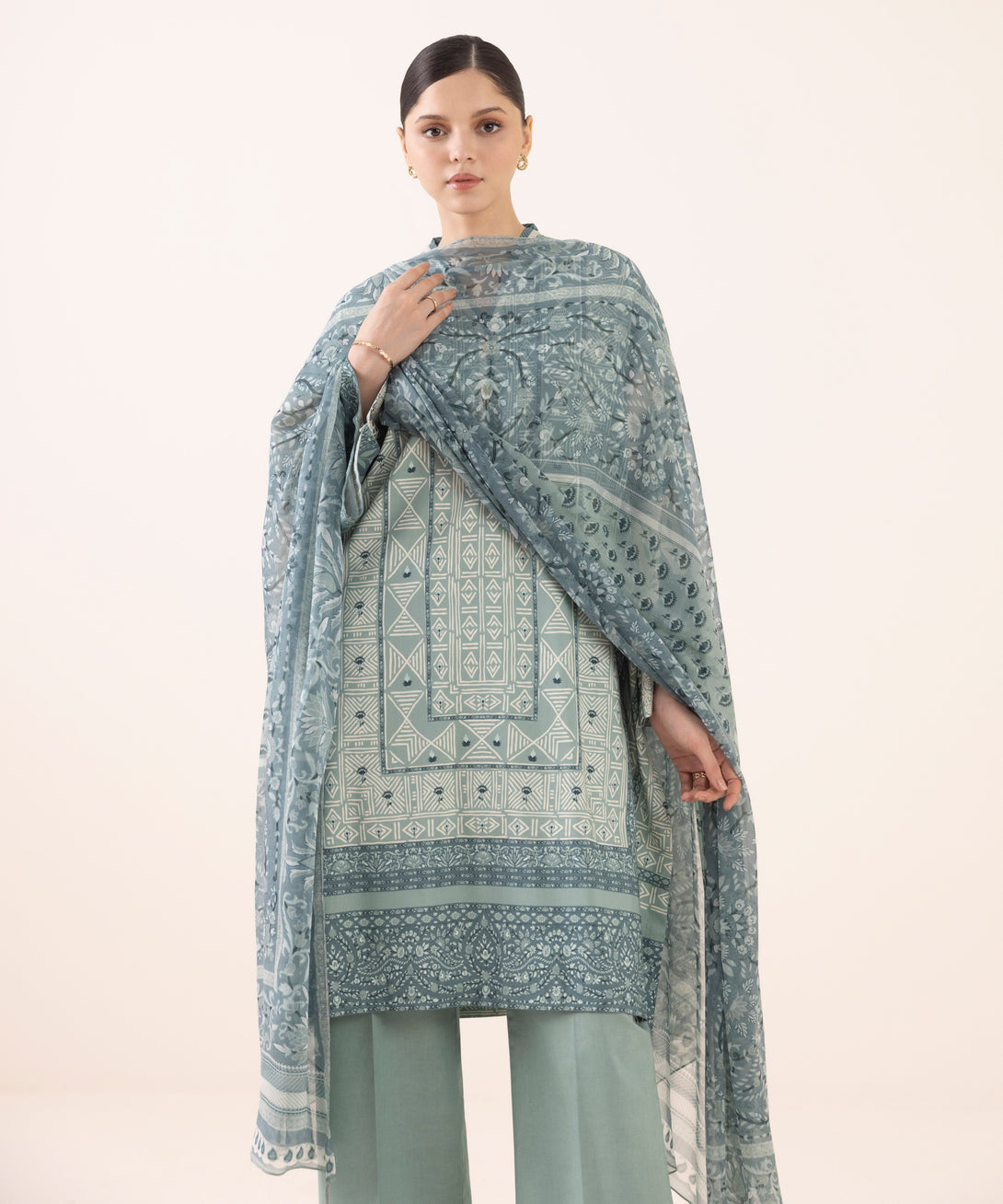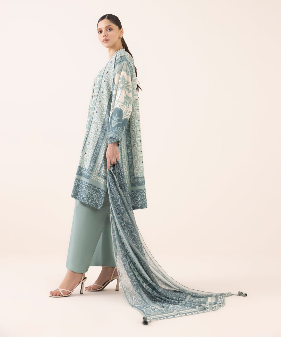 Elevate your style with our three-piece printed ensemble featuring a light linen shirt paired with a blended chiffon dupatta and cotton trousers.