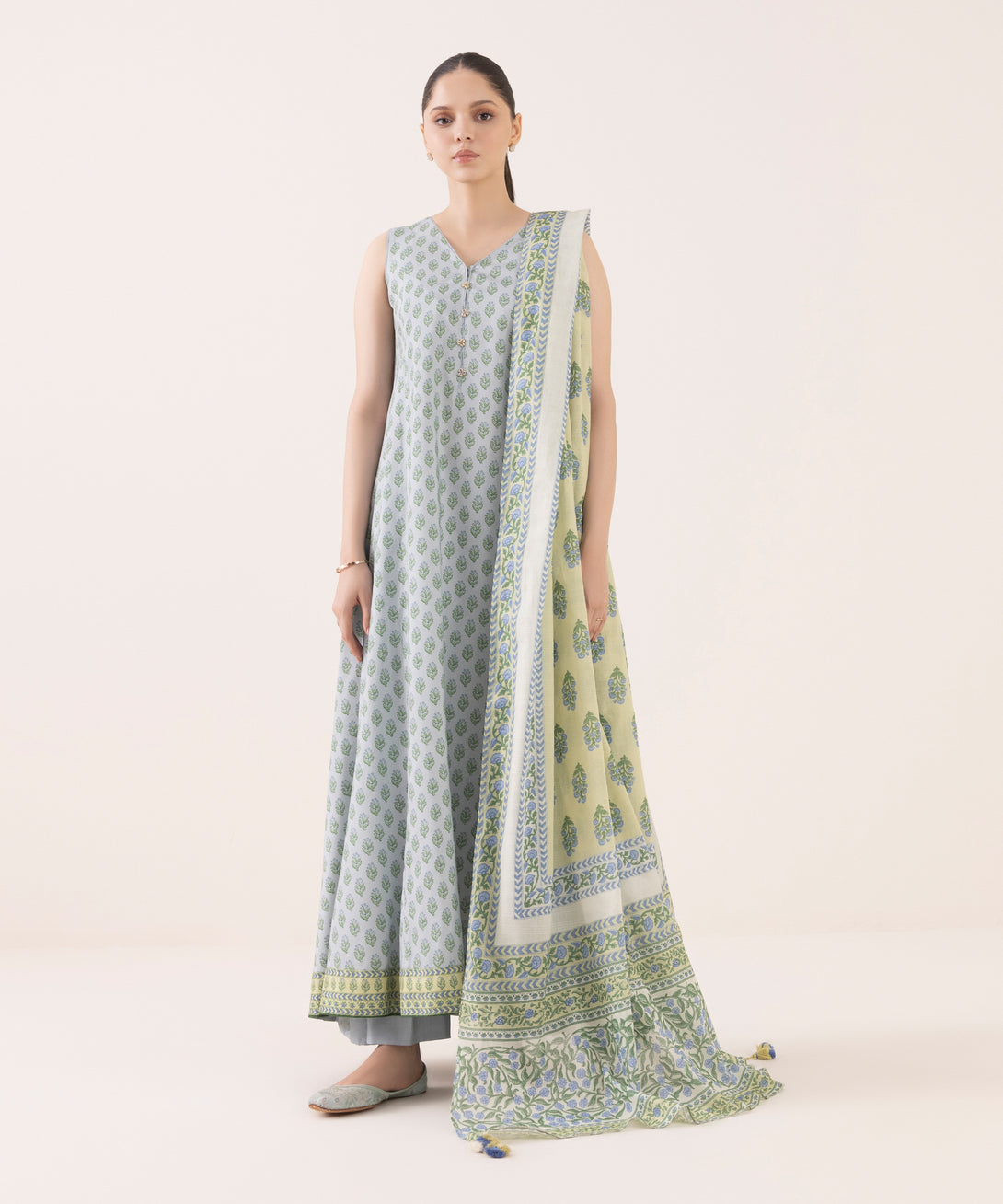 Make a statement with our three-piece printed ice grey ensemble featuring a light linen shirt paired with a textured voile dupatta and cotton trousers.