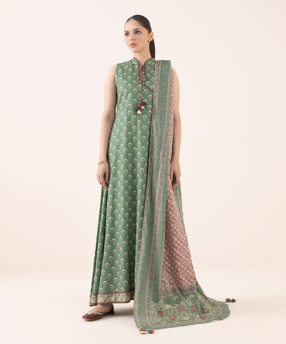Make a statement with our three-piece printed ensemble featuring a light linen shirt paired with a textured voile dupatta and cotton trousers.