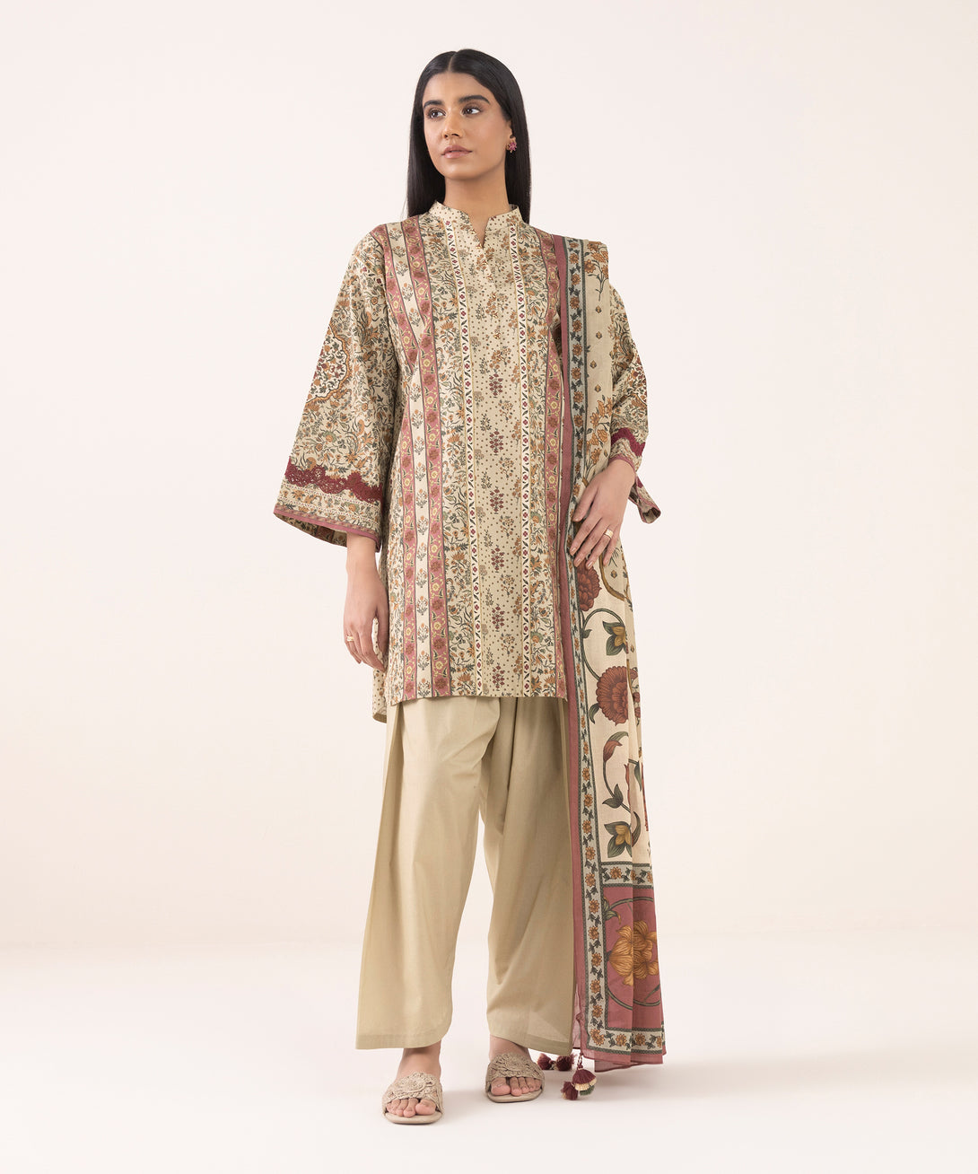 Make a statement with our three-piece printed ensemble featuring a cotton shirt and trousers paired with a voile dupatta.