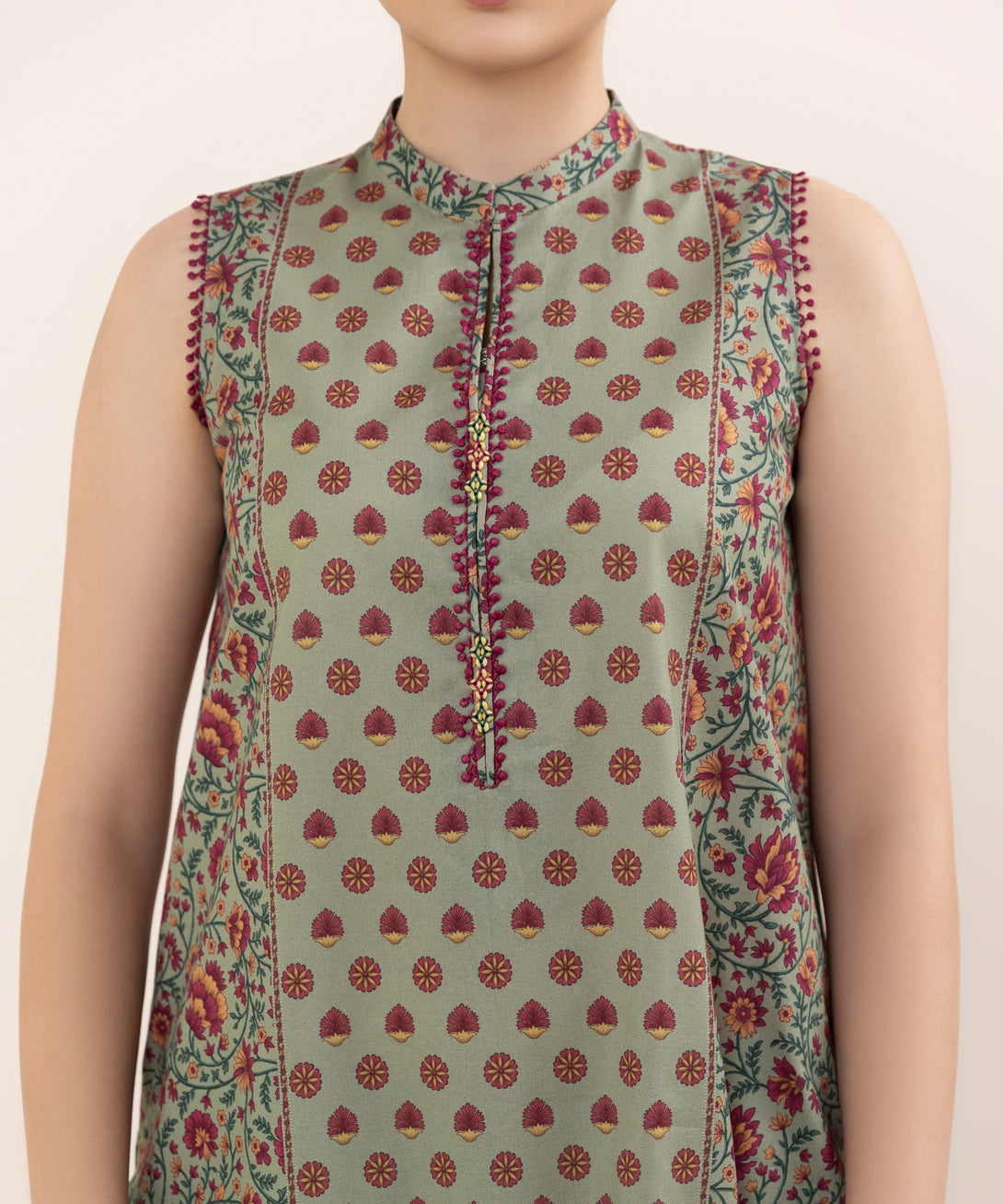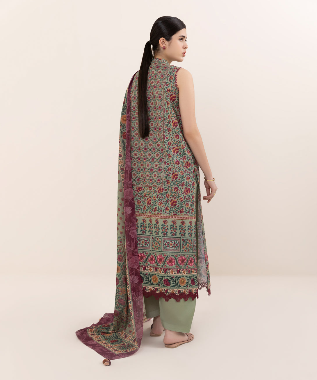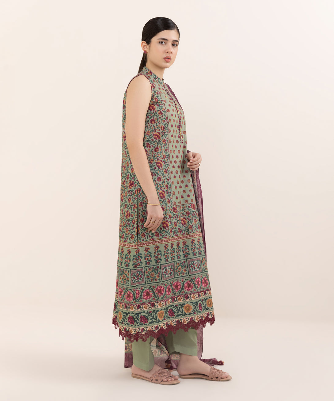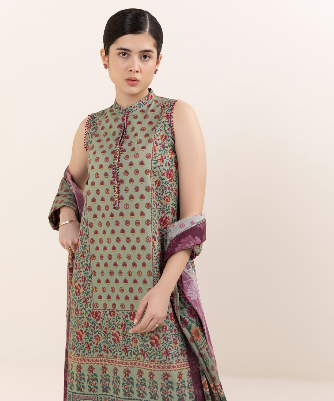 Make a statement with our three-piece printed sage green and red ensemble featuring a cotton shirt and trousers paired with a voile dupatta.