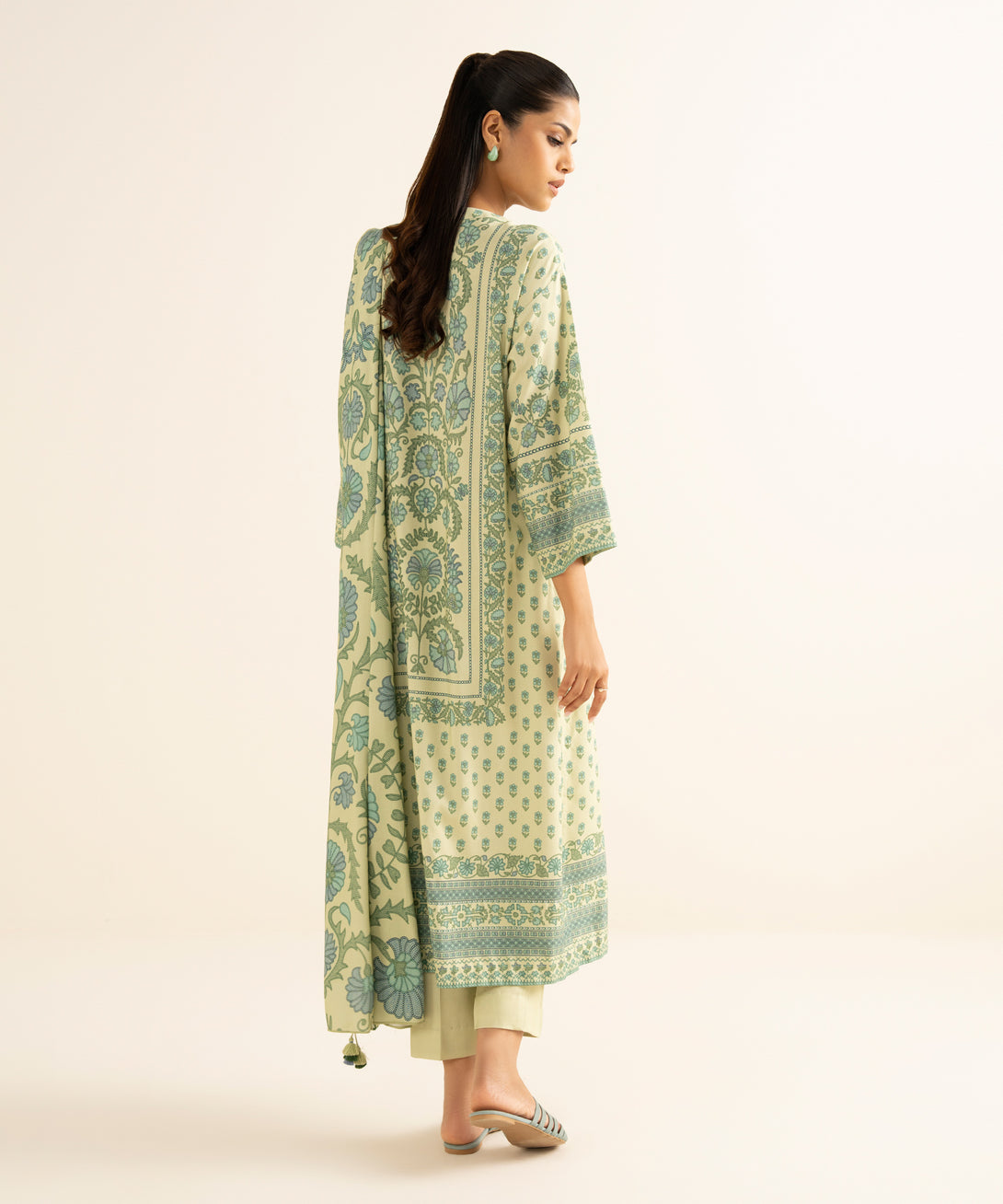 Make a statement with our three-piece printed ensemble featuring a linen shirt and trousers paired with a light linen dupatta.