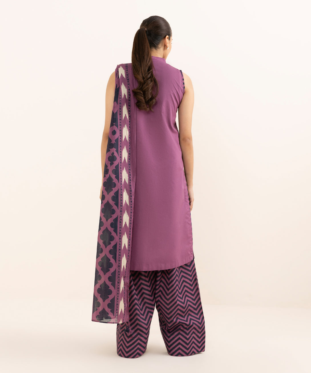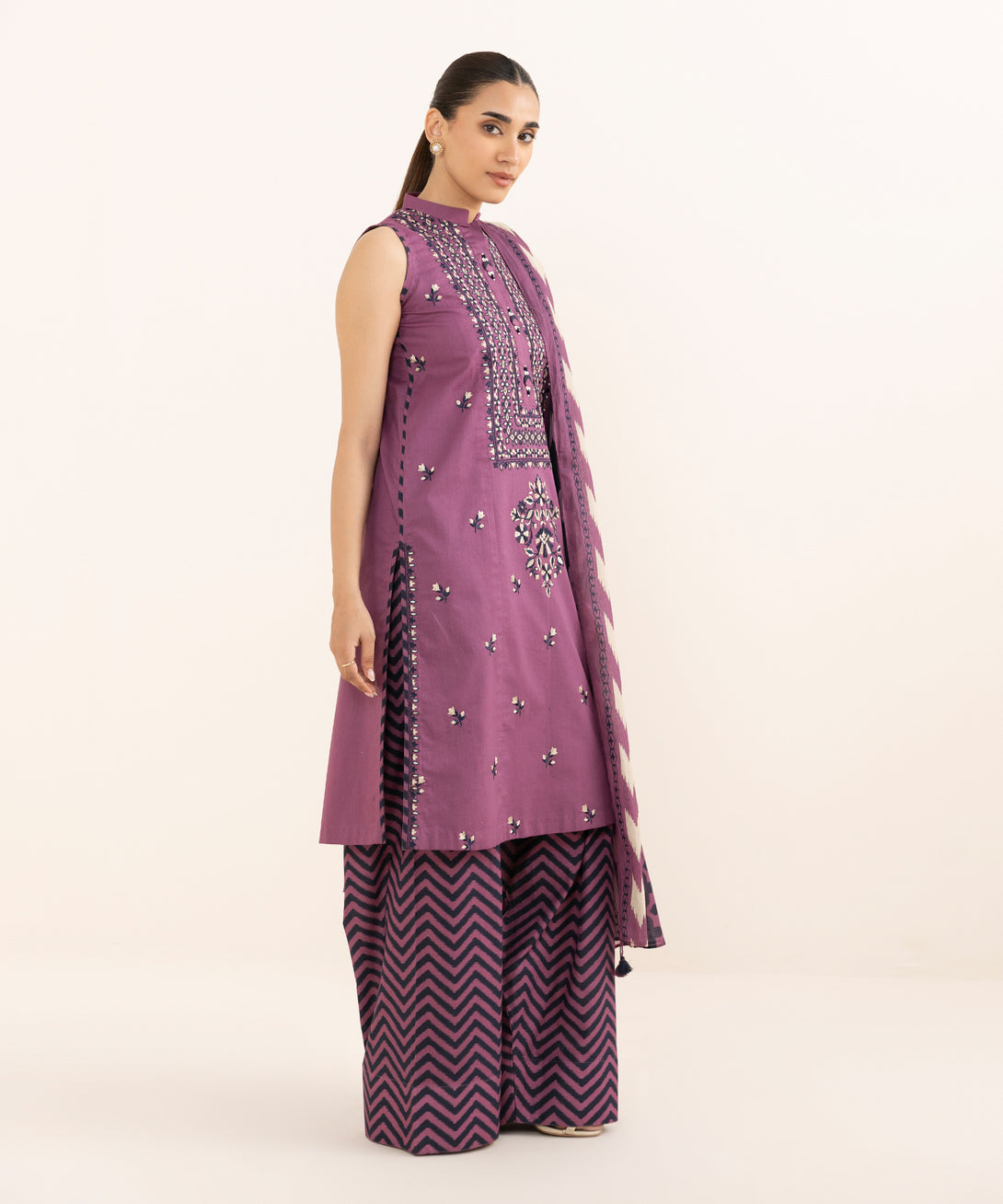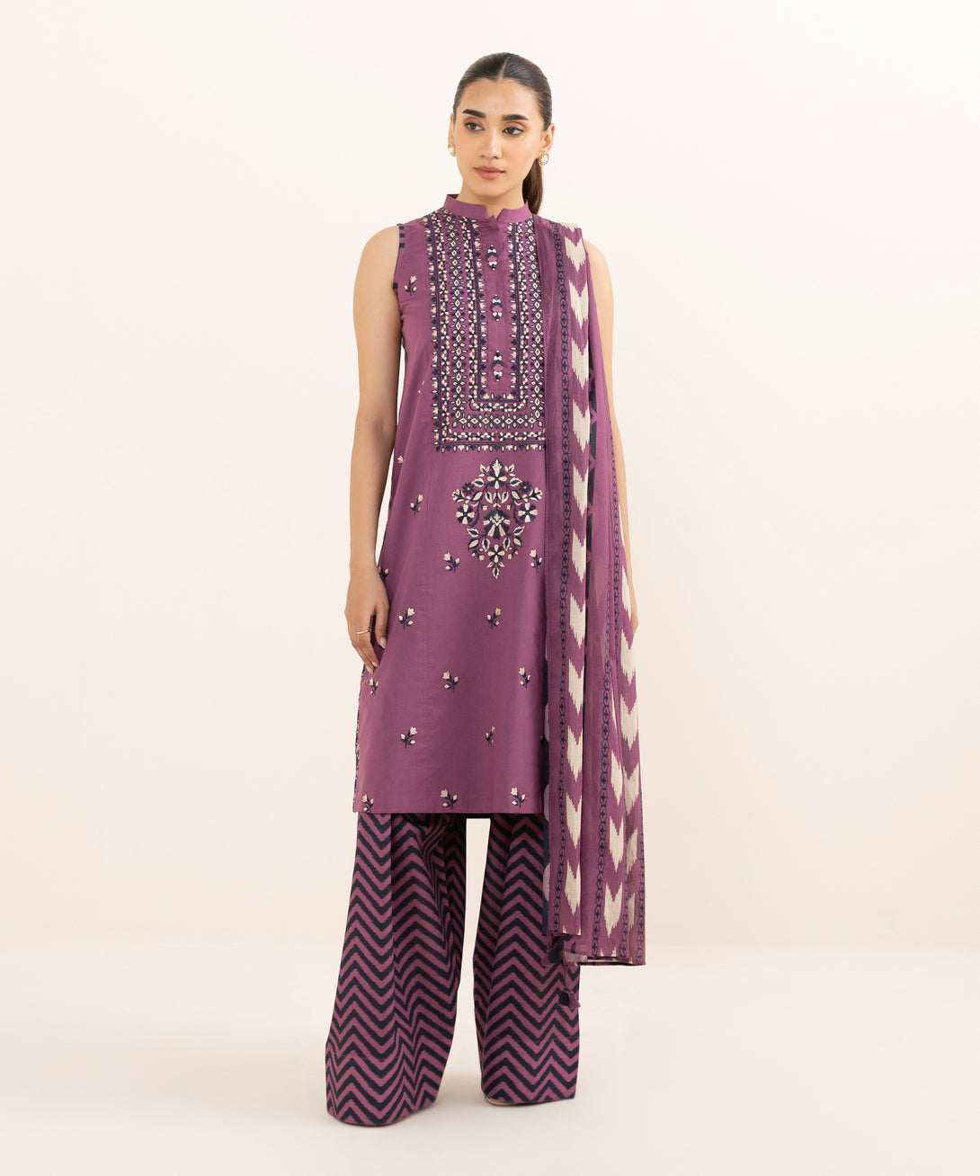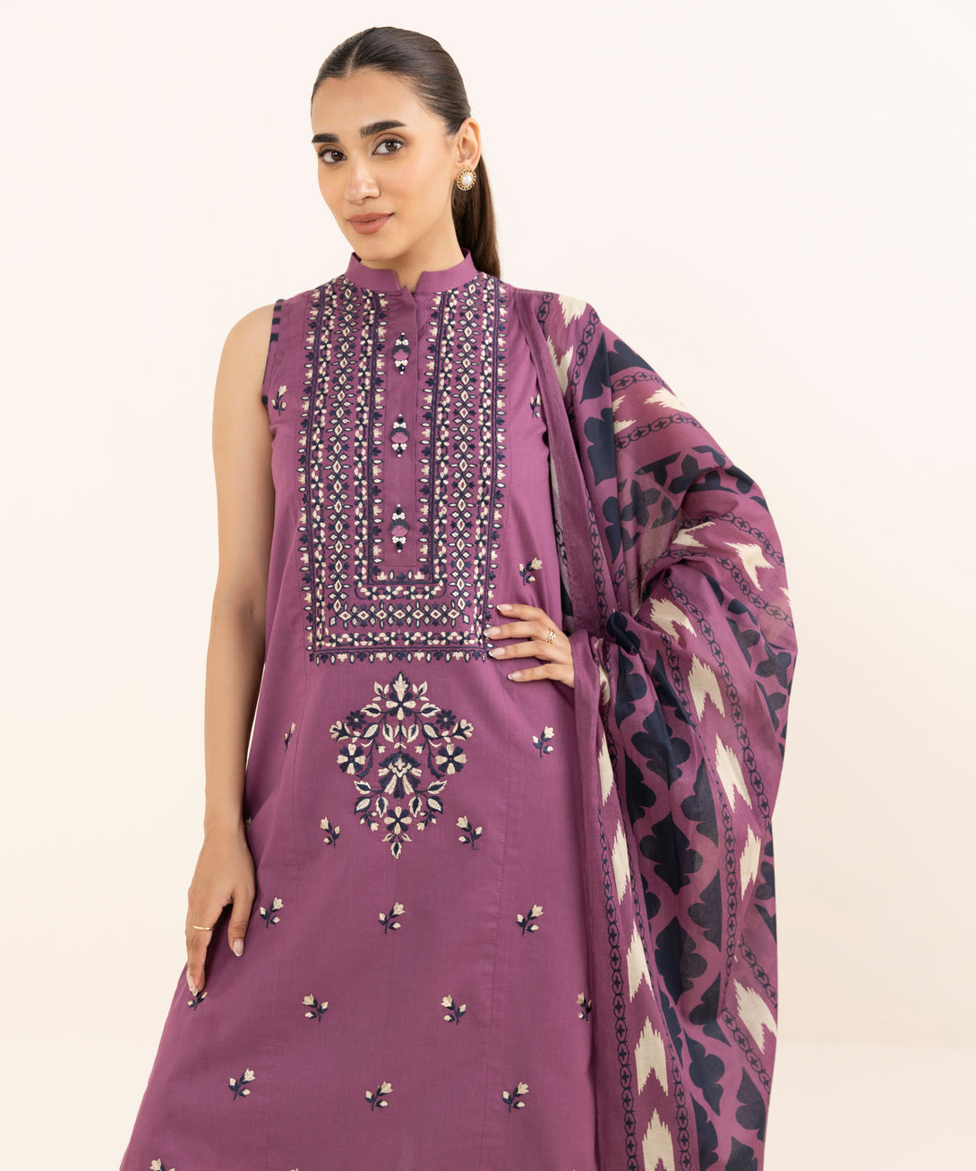Make a statement with our three-piece embroidered ensemble featuring a dobby shirt paired with a voile dupatta and cotton trousers.