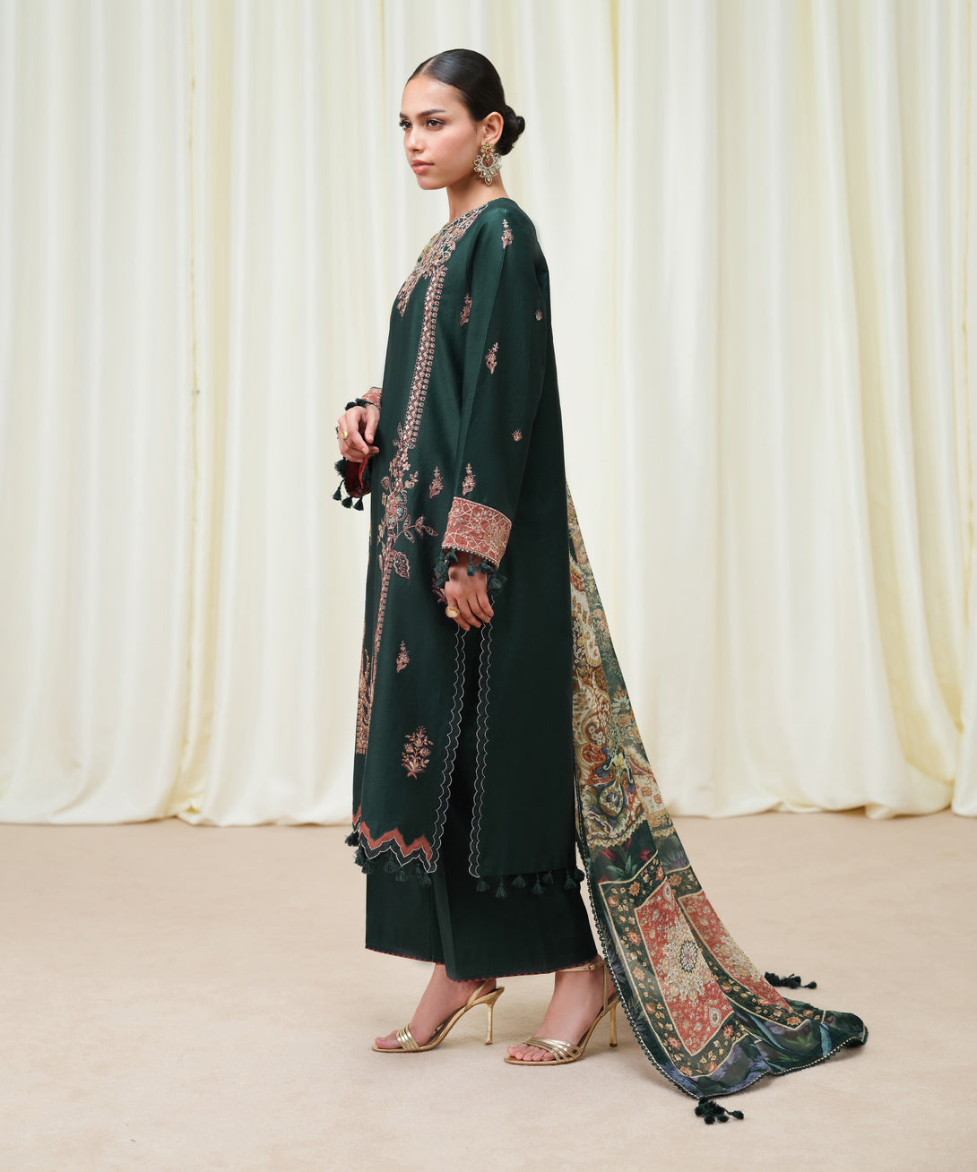 Make a statement with our three-piece embroidered green ensemble featuring a fine cotton satin shirt paired with a bemberg tissue dupatta and cotton trousers.
